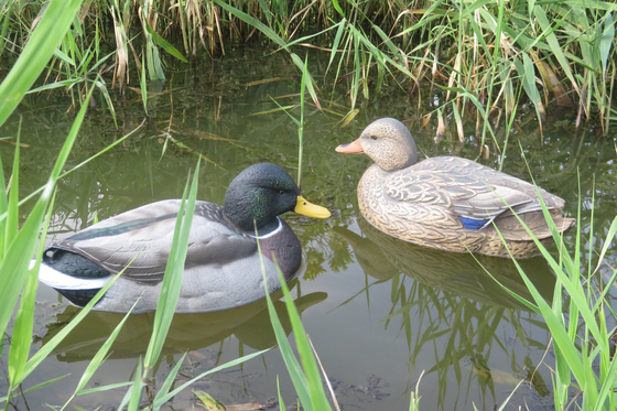 この鳥たちの集まる習性を利用して作られたのが「デコイ」です。木片や藁などで鳥の形に似せたデコイを水辺にたくさん置くと、鳥たちが仲間がいると思い集まってきます。