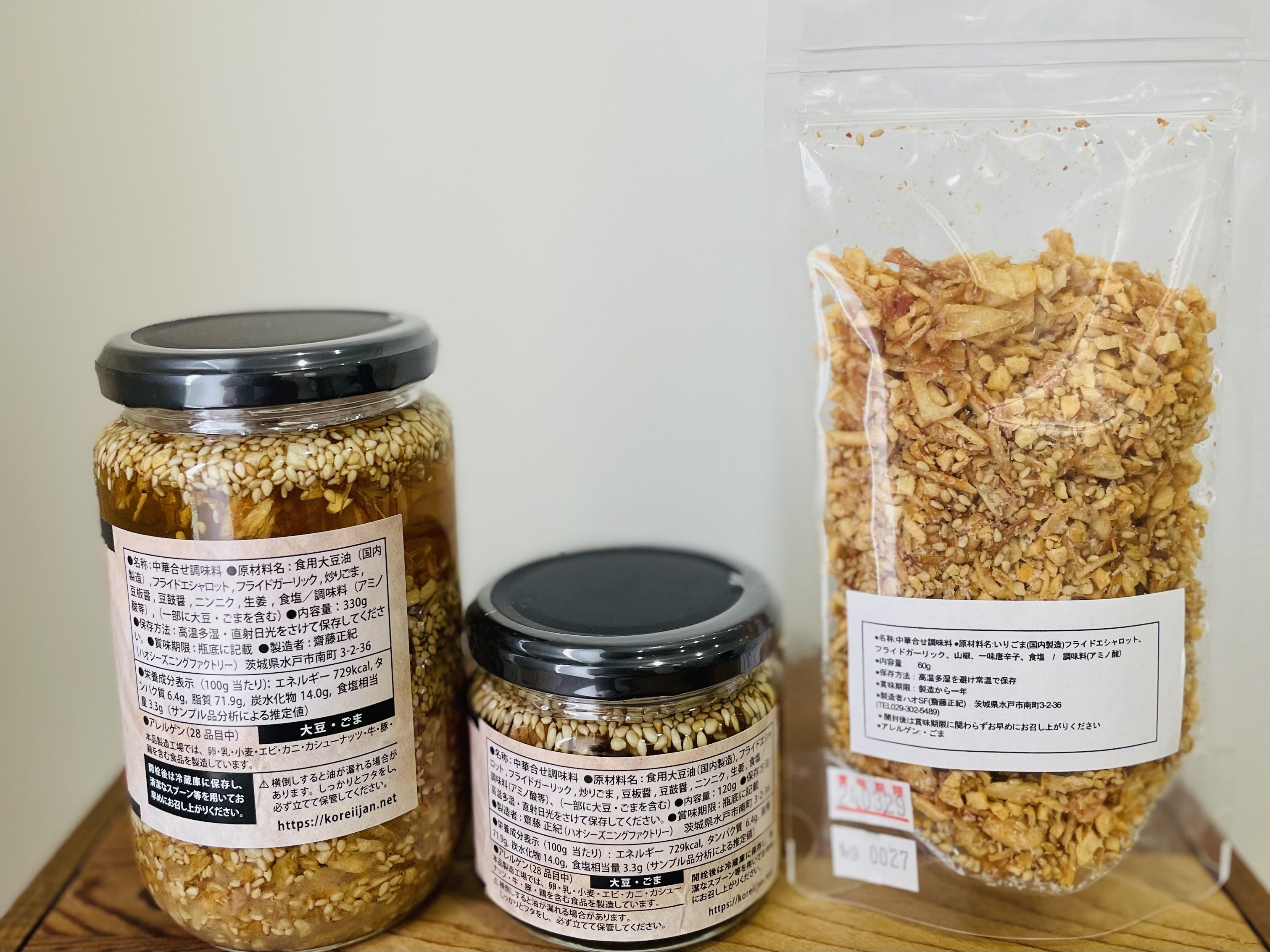 香ばしいたっぷりのゴマとフライドガーリック・フライドエシャロットのザクザク感に、にんにく・生姜のうまみと豆板醤・豆鼓醤が加わった万能調味料です。辛くないのでお子様も一緒に食べることができます。
