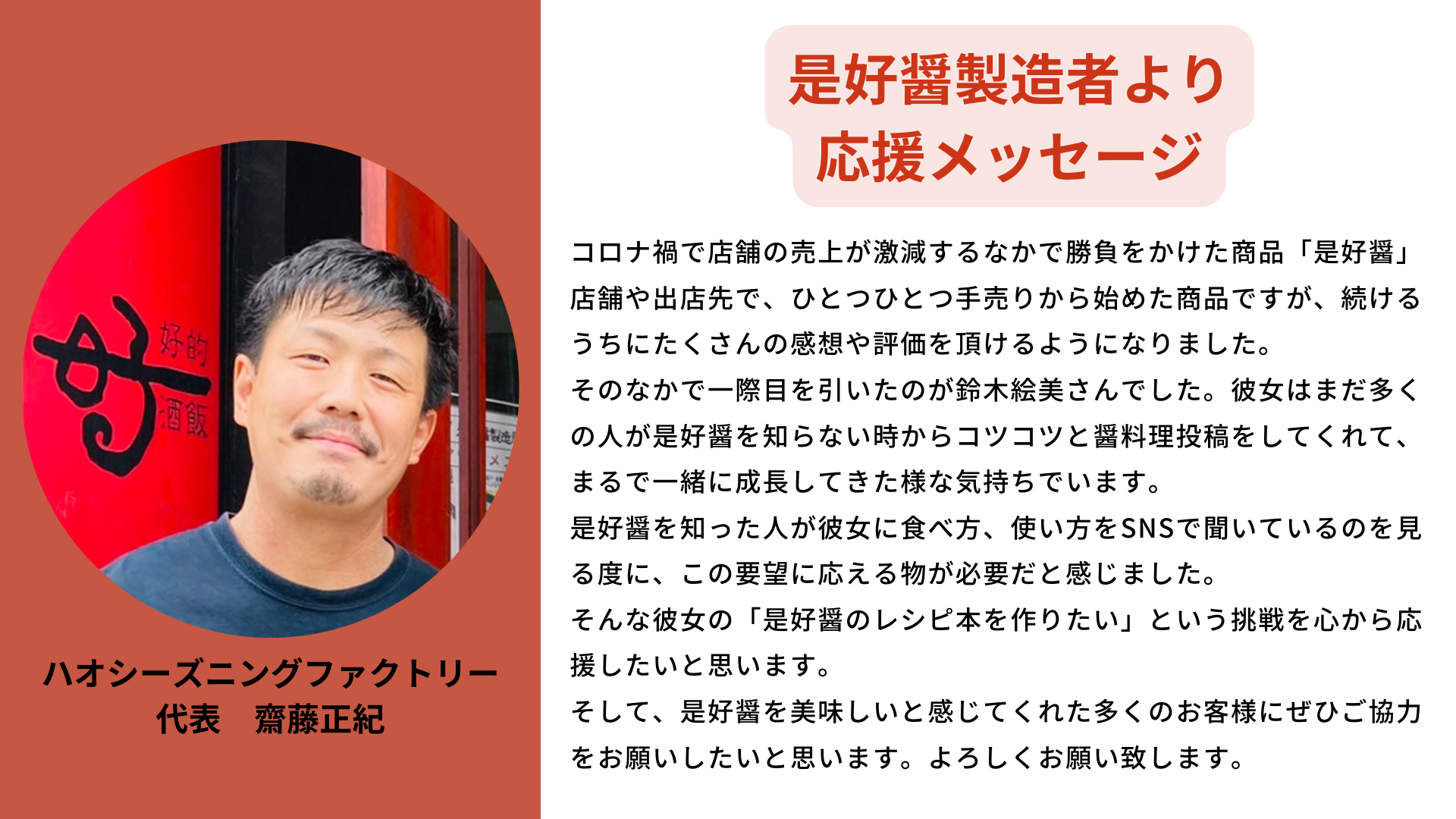 自分の料理が家族以外の役に立つなんて考えたこともありませんでした。醤ユーザーさんからよく聞かれる「どうやって食べるの?」「アレンジ方法は?」の疑問の声に応えたい!そして、たくさんの方に是好醤の無限の可能性を知ってもらいたい!そんな想いからこのプロジェクトをはじめる決意をいたしました。