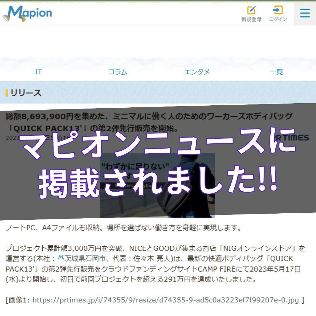 ワーカーズボディバッグ「QUICK PACK 13'」が、【マピオンニュース】に掲載していただきました!