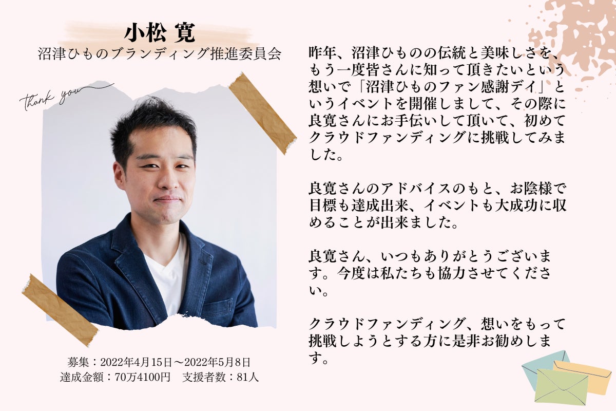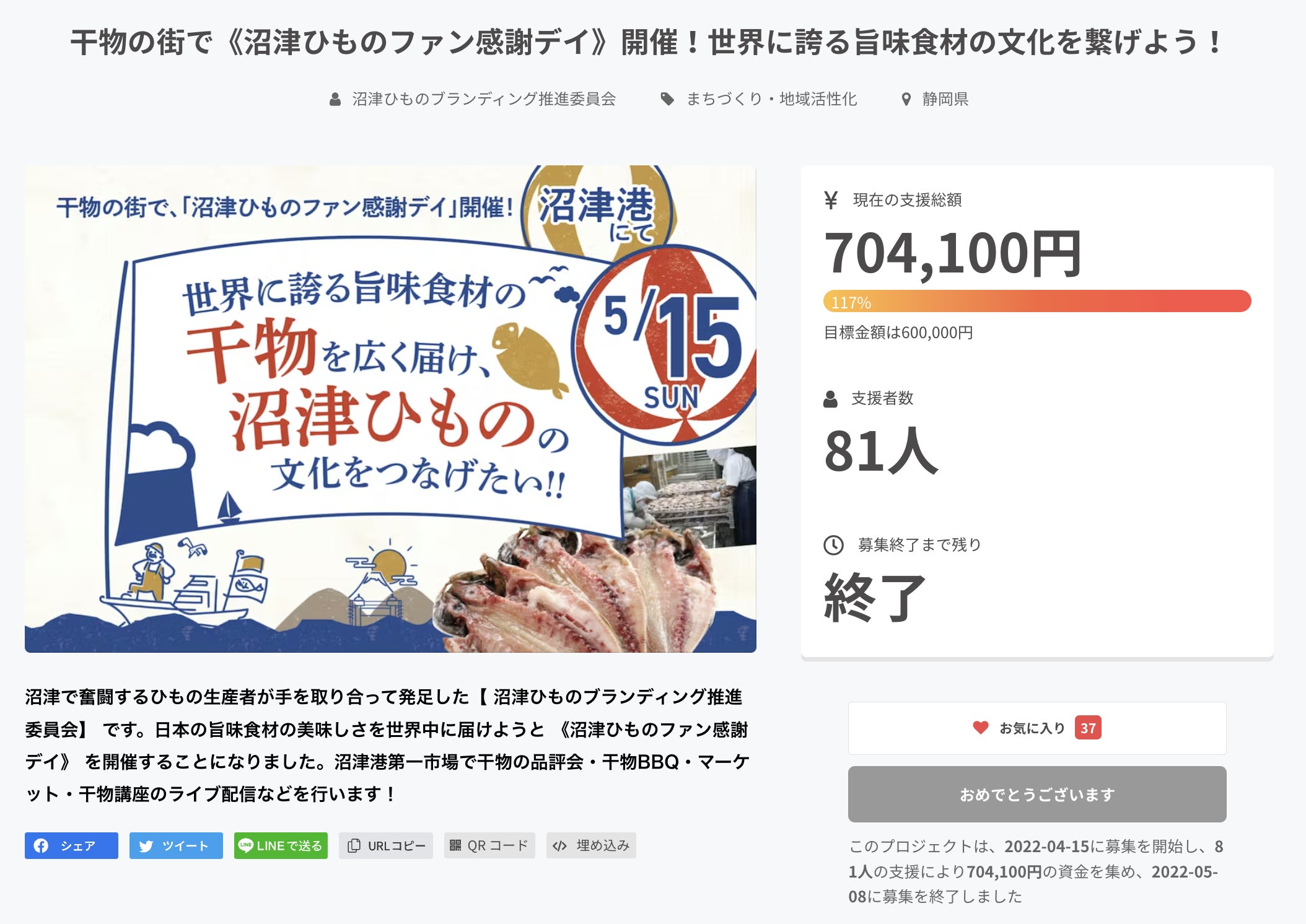 そして、2022年5月15日(日)に沼津港第一市場で開催した《 沼津ひものファン感謝デイ 》のイベント告知プロモーション施策の一環としてクラウドファンディングに挑戦されました。