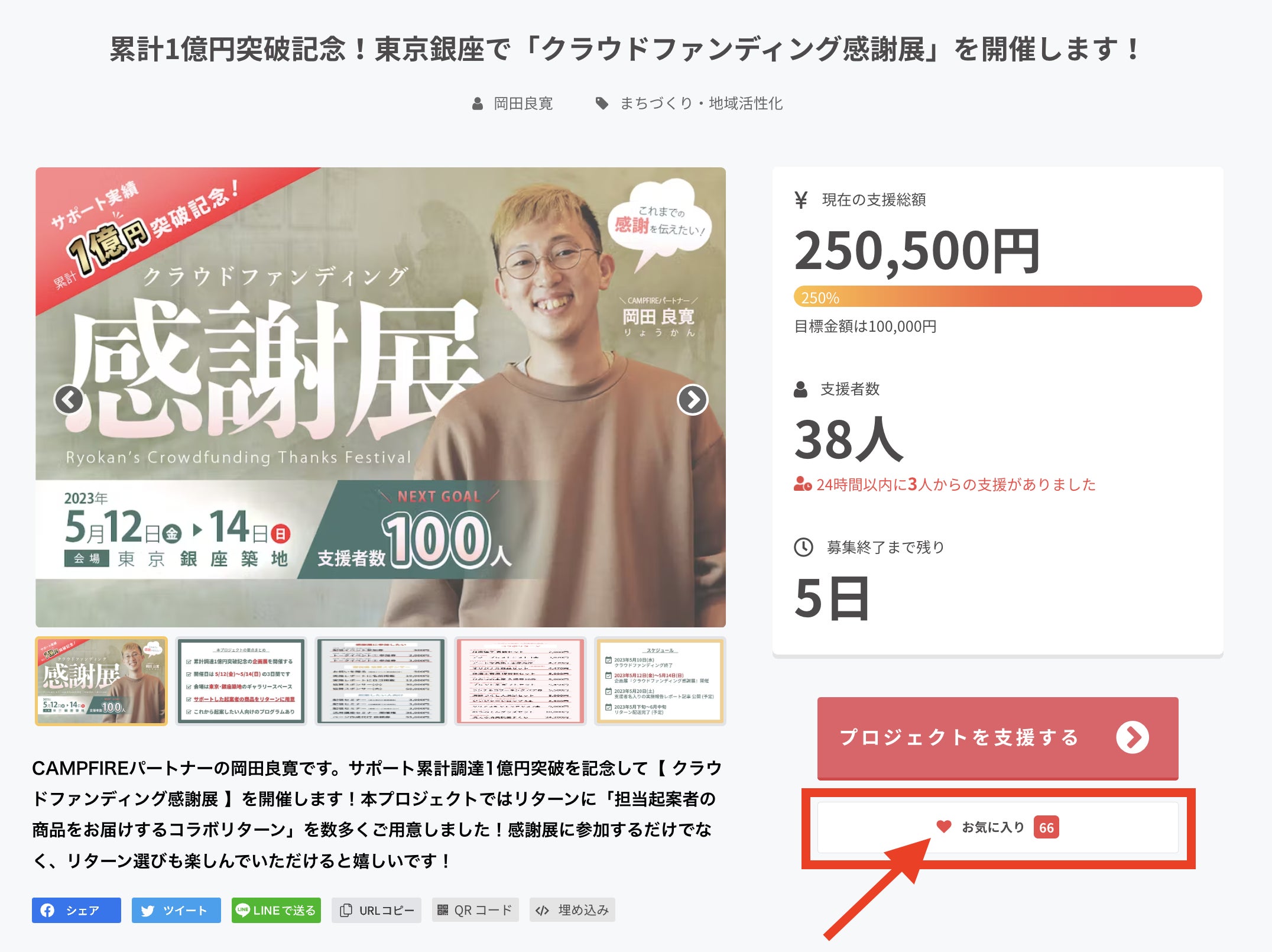 これまでサポートしたプロジェクトの累計調達金額が1億円を突破したことを記念した「クラウドファンディング感謝展」を開催するためのクラウドファンディングを実施しています。