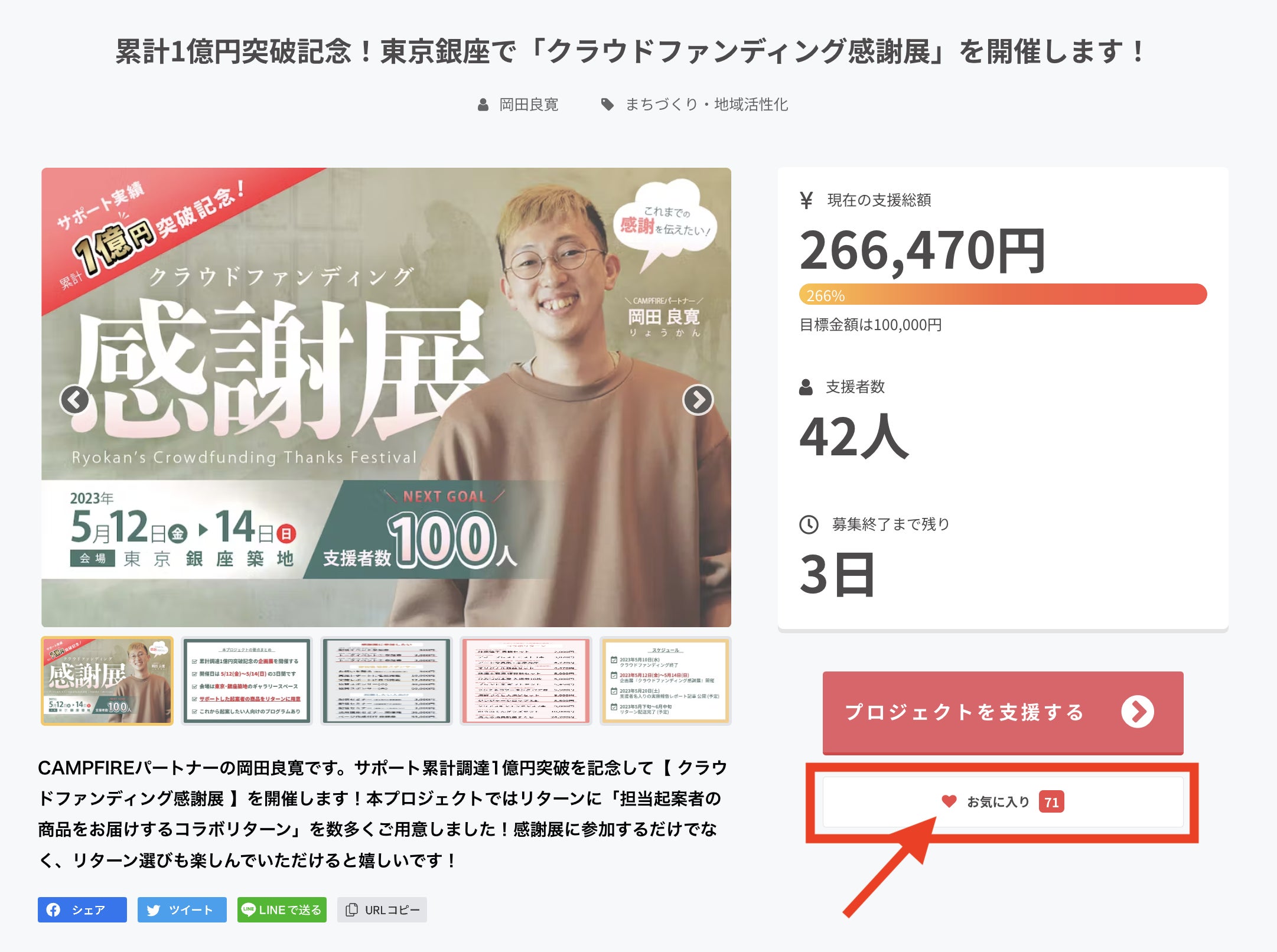 これまでサポートしたプロジェクトの累計調達金額が1億円を突破したことを記念した「クラウドファンディング感謝展」を開催するためのクラウドファンディングを実施しています。