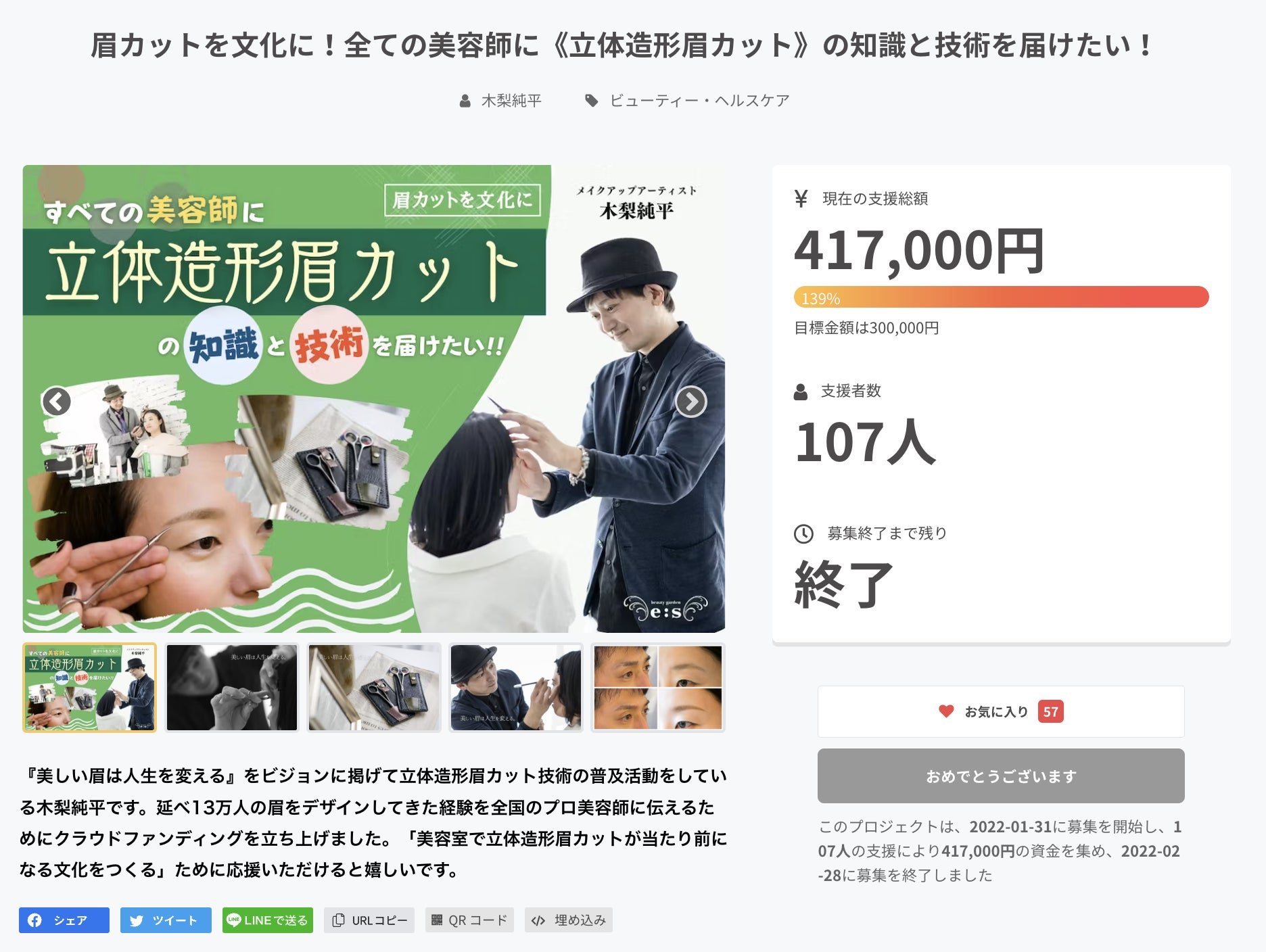 一般の人向けの「オンラインメイクアップ講座」をはじめ、美容師アイリスト向けの「眉カット技術サロン半年体験」などのリターンを用意し、総勢107名からの支援を集めました!
