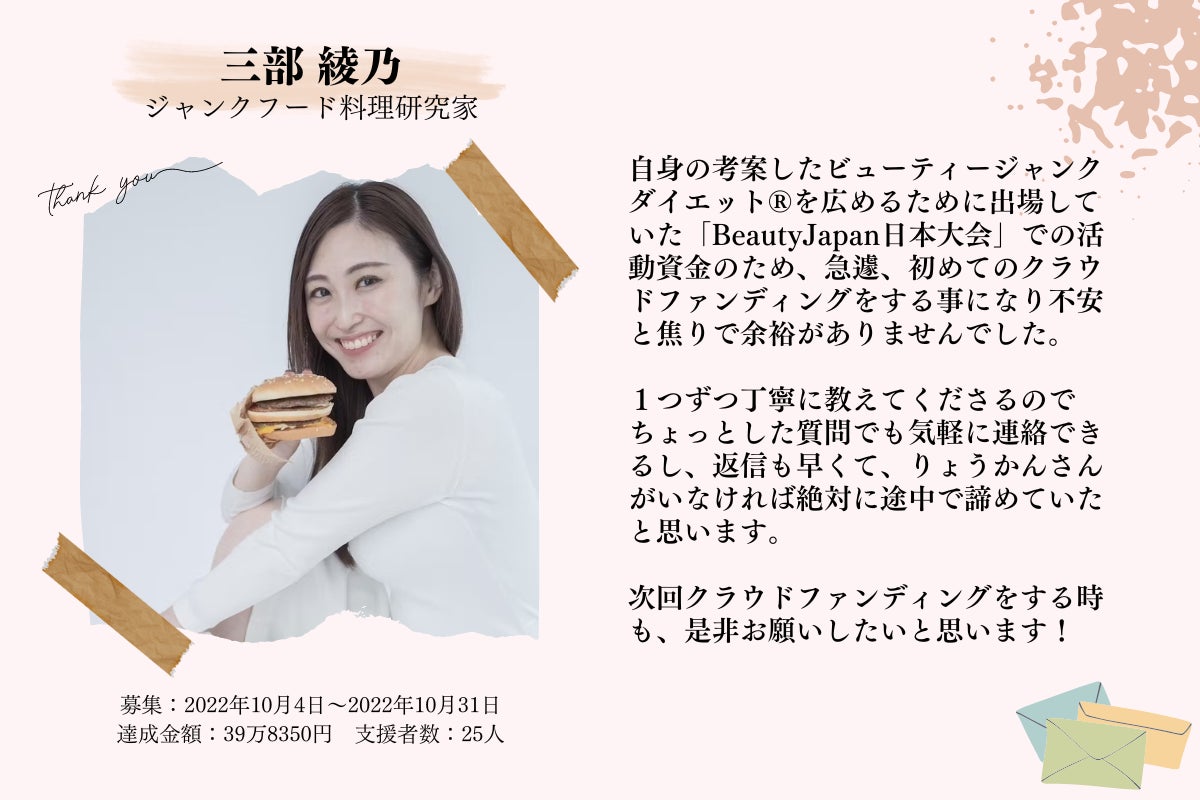 三部綾乃さんは、自身がジャンクフードをやめられなかった経験を元に【 ビューティージャンクダイエット®︎ 】を考案。
