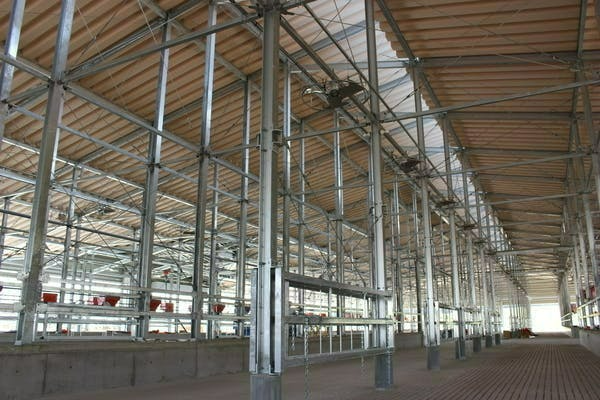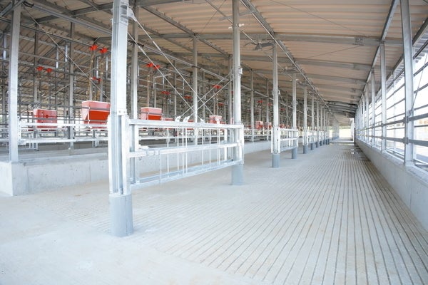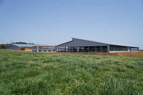 4棟の牛舎は自然の換気で新鮮に保たれるように設計。西から東へ吹く偏西風が前後のシャッターから抜けていきます。