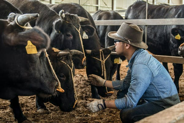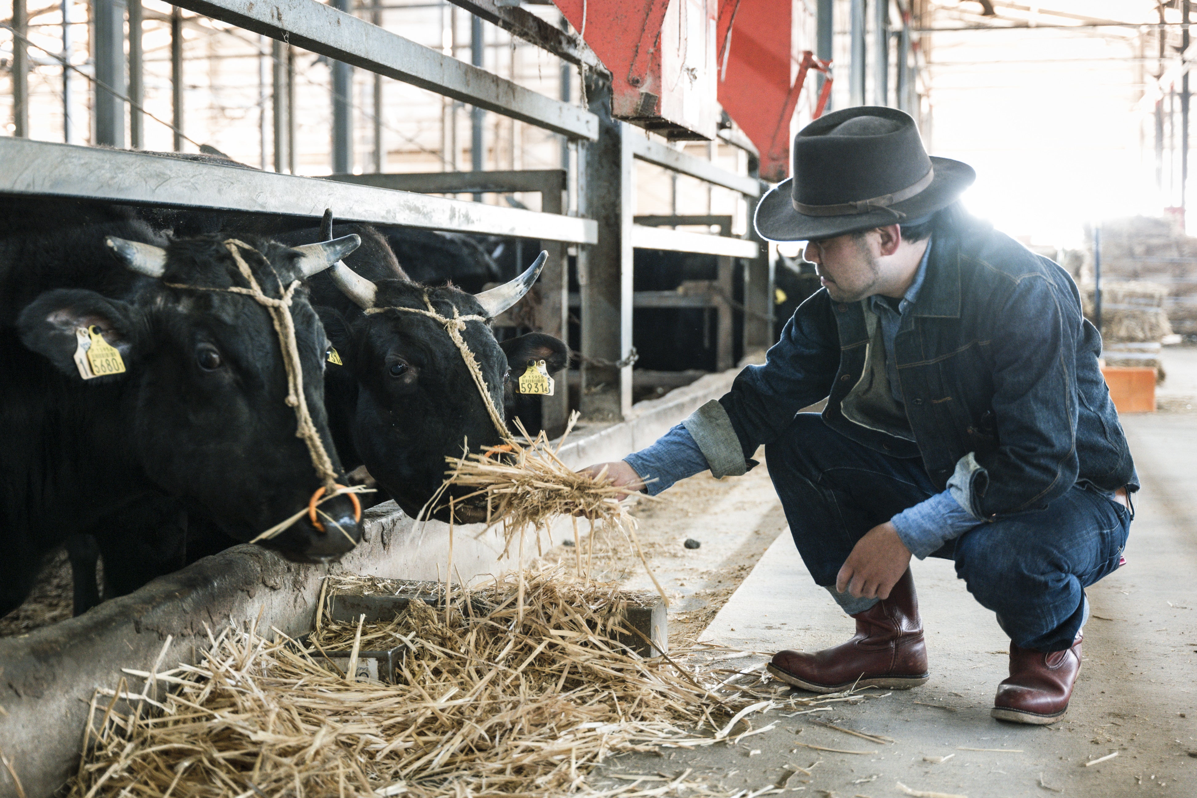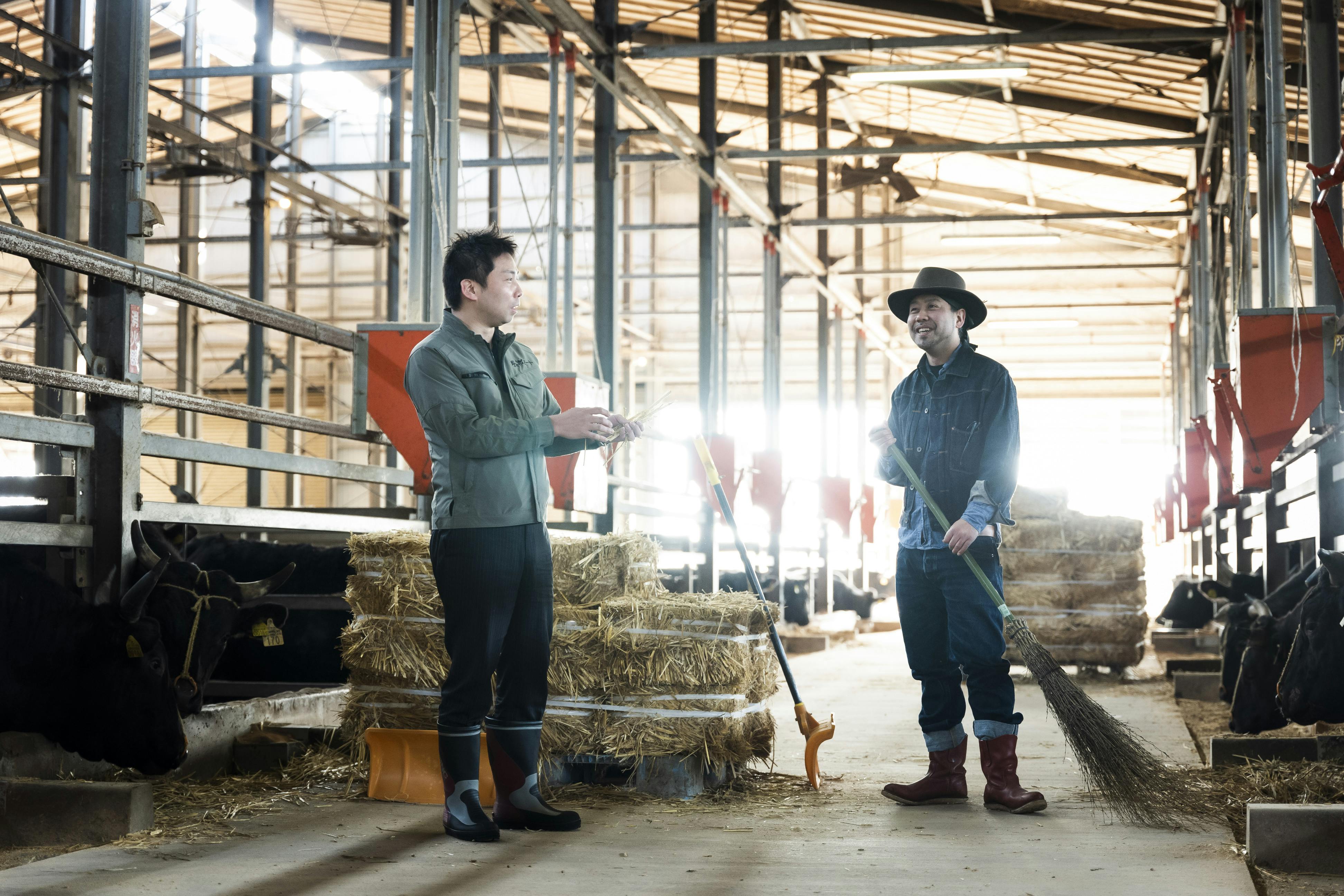 牛を観察し、クリエティブな思考を積み重ねる平林さん。長年の研究で和牛の伝統的な肥育方法に倣い、ヨーロッパにおける長期肥育の考え方を掛け合わせることで、自分が求める和牛を作ることができると考えています。