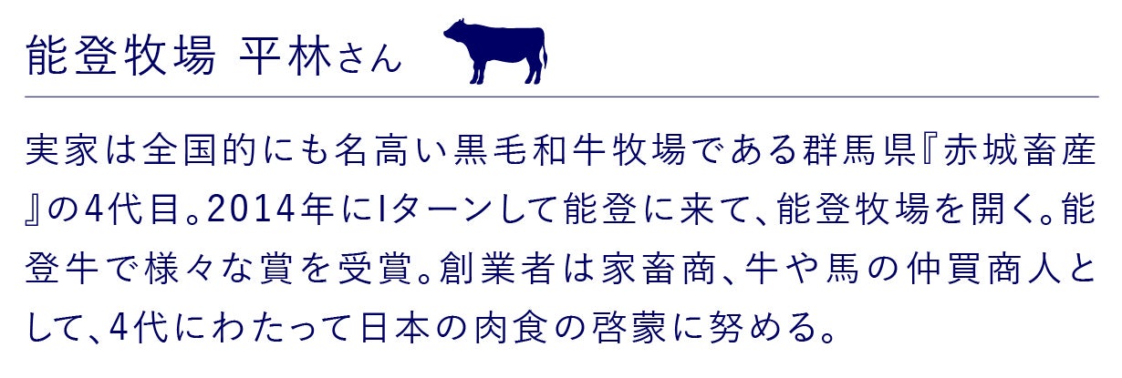 能登牧場の平林さんは、創業100年の畜産業を営む家に生まれ、能登牛の可能性に惹かれ2014年に能登牧場を開場。県内外の品評会で数多く受賞しています。