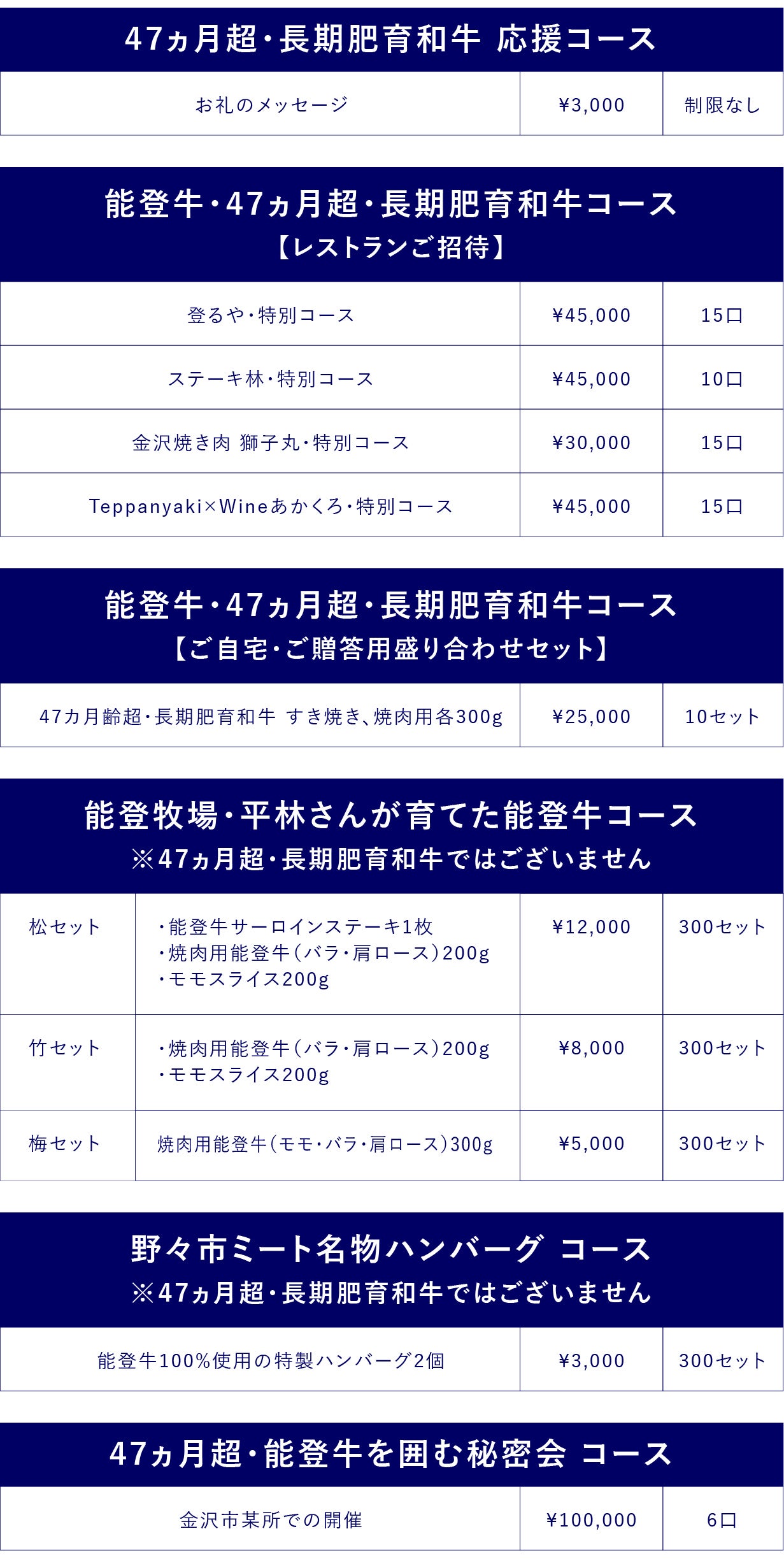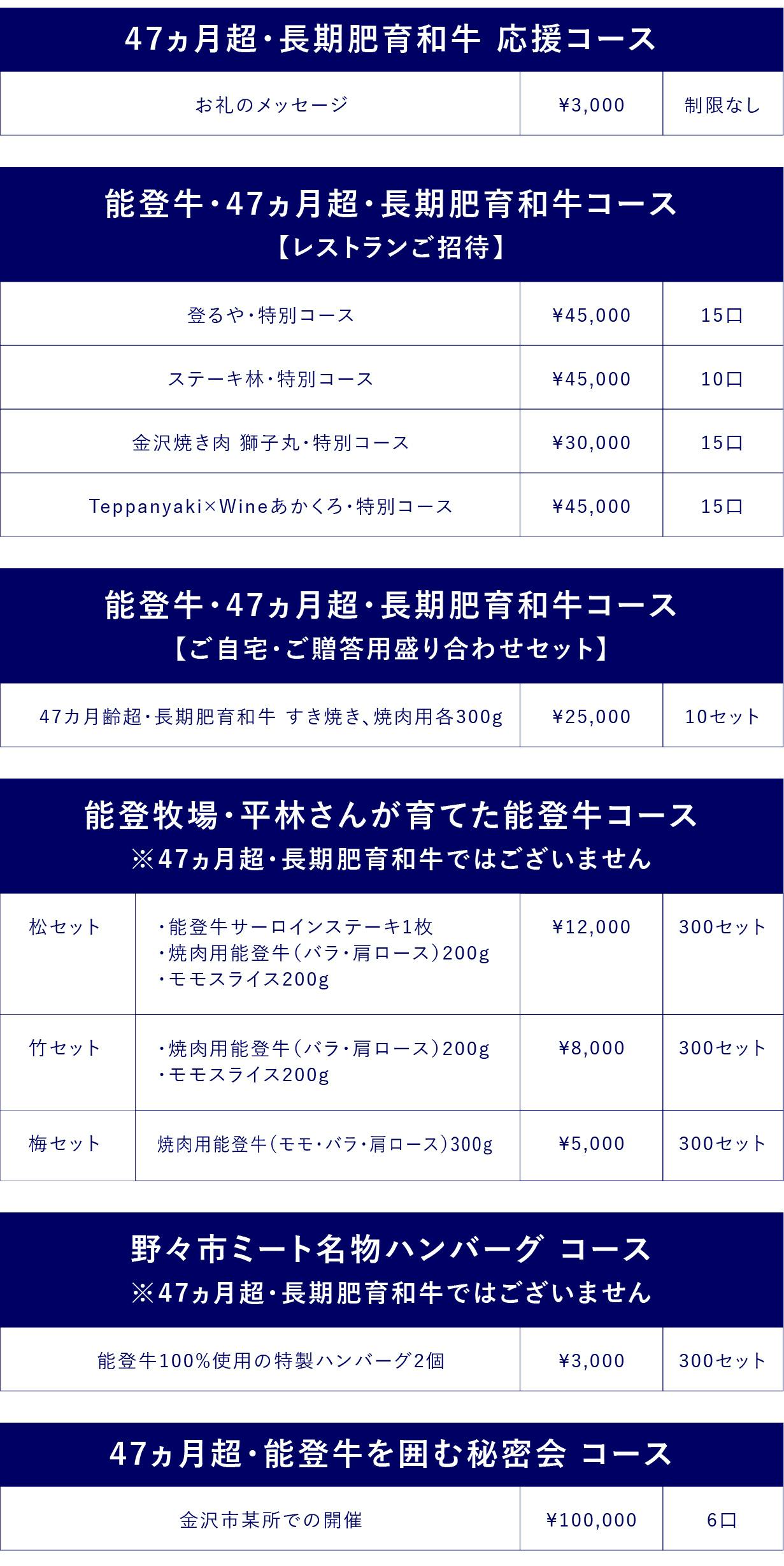 再び中田の方からリターンのご紹介をさせていただきます。47ヵ月超・長期肥育和牛のレストランコースに加え、10セット限定のご自宅用・ご贈答用、さらに平林さんが育てた能登牛セットなどをご用意しました。