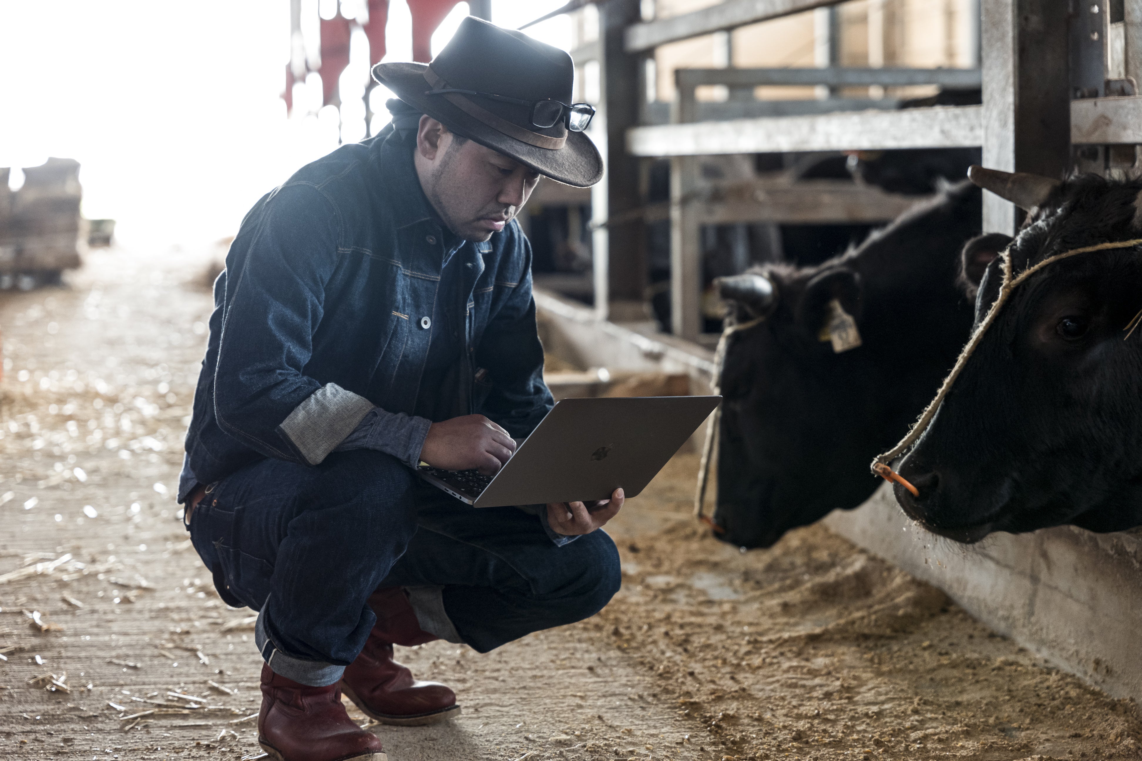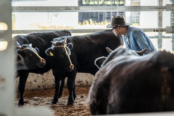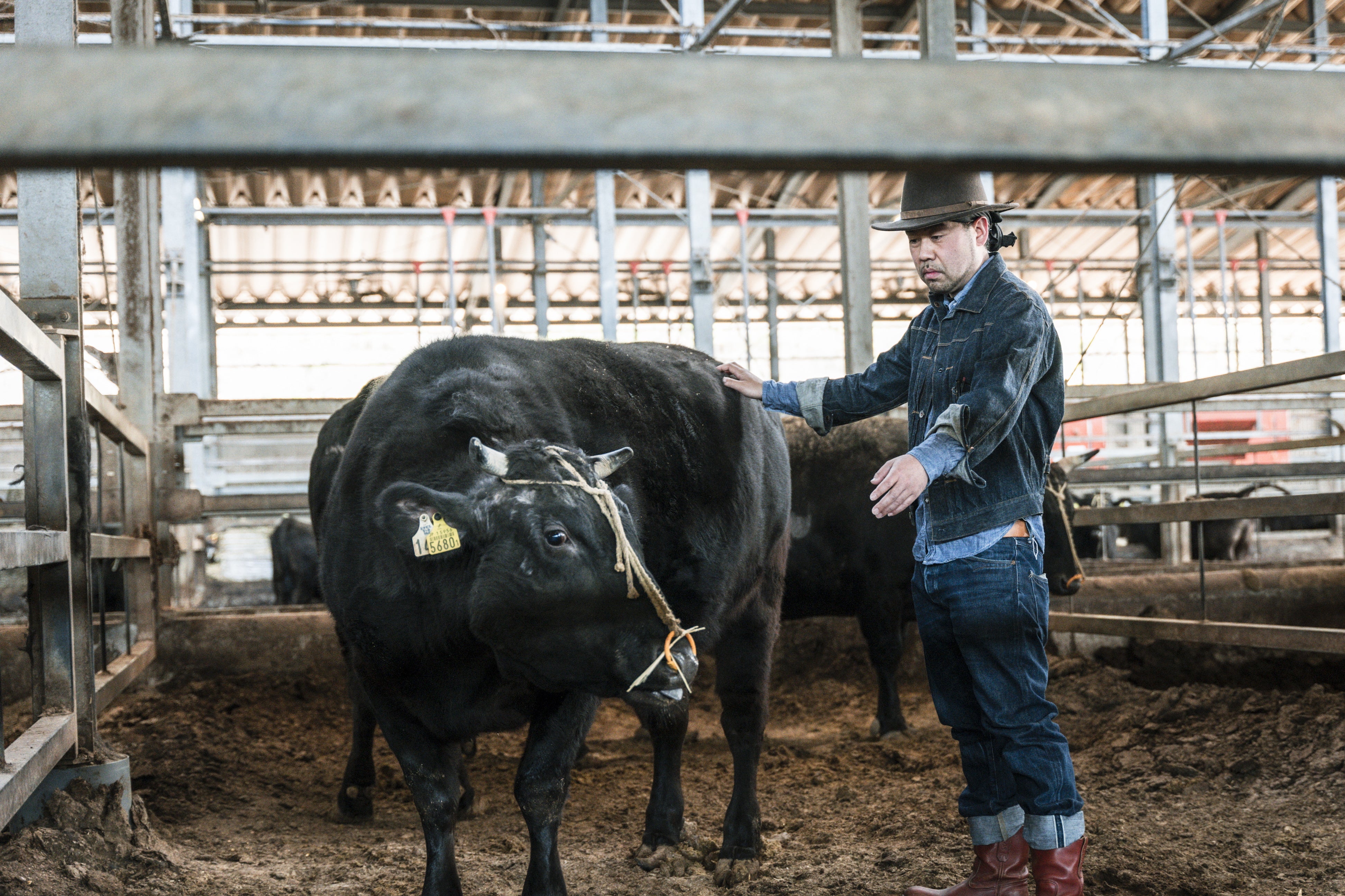 牛を観察し、クリエティブな思考を積み重ねる平林さん。長年の研究で和牛の伝統的な肥育方法に倣い、ヨーロッパにおける長期肥育の考え方を掛け合わせることで、自分が求める和牛を作ることができると考えています。