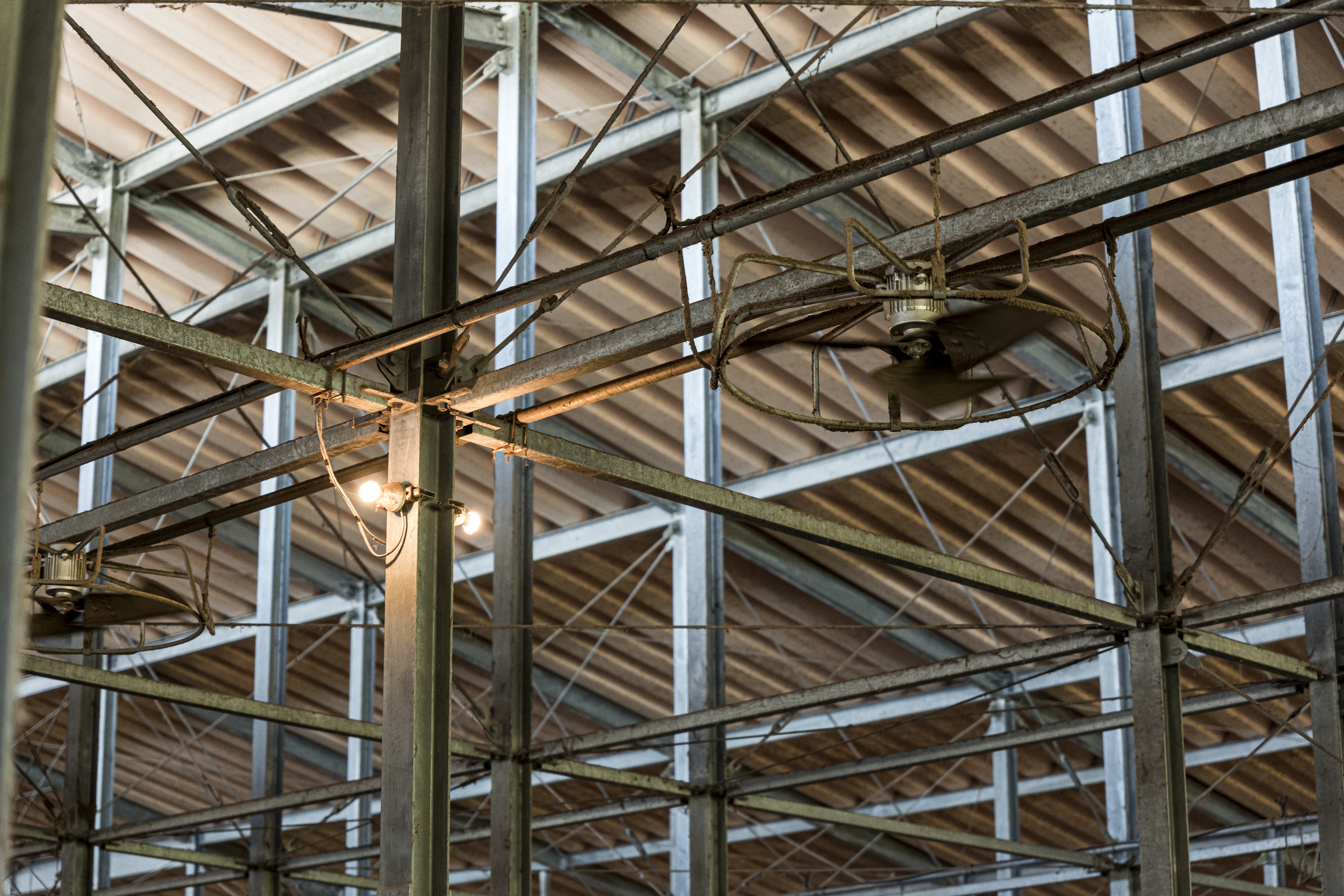 4棟の牛舎は自然の換気で新鮮に保たれるように設計。西から東へ吹く偏西風が前後のシャッターから抜けていきます。