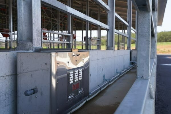365日24時間牛が自由に飲める自動給水機を設置。牛は胃の中の微生物が働きで食べたものが消化されます。微生物の働きを促すために冷水は適していないので、常に15~20℃の温度に保たれています。