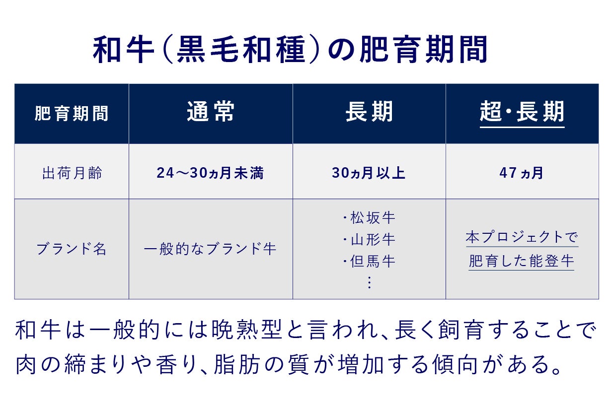 この体験が「特産松阪牛は38ヵ月、山形牛は1,000日肥育といった知名度の高いブランド牛が当たり前に取り組んでいる長期肥育。47ヵ月くらい育てたらどうなるのか?」。この好奇心が能登牛の長期肥育、超・長期肥育への挑戦を決意させました。