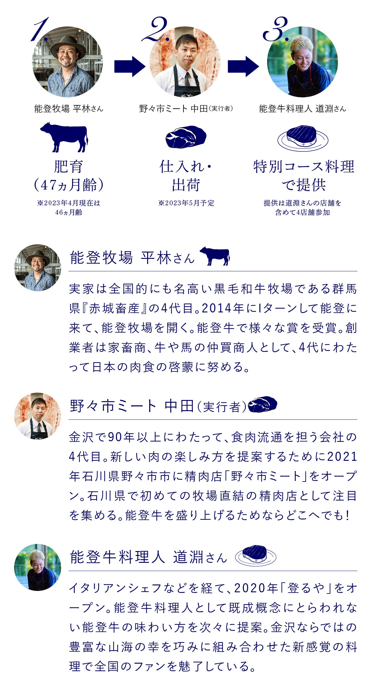 能登牧場平林さんと中田がご案内する、能登牛を語らう食談です。47ヵ月超・長期肥育和牛でこの日のためだけの能登牛フルコースをご提供いたします。本プロジェクトの裏話など、能登牛について語り合いましょう!