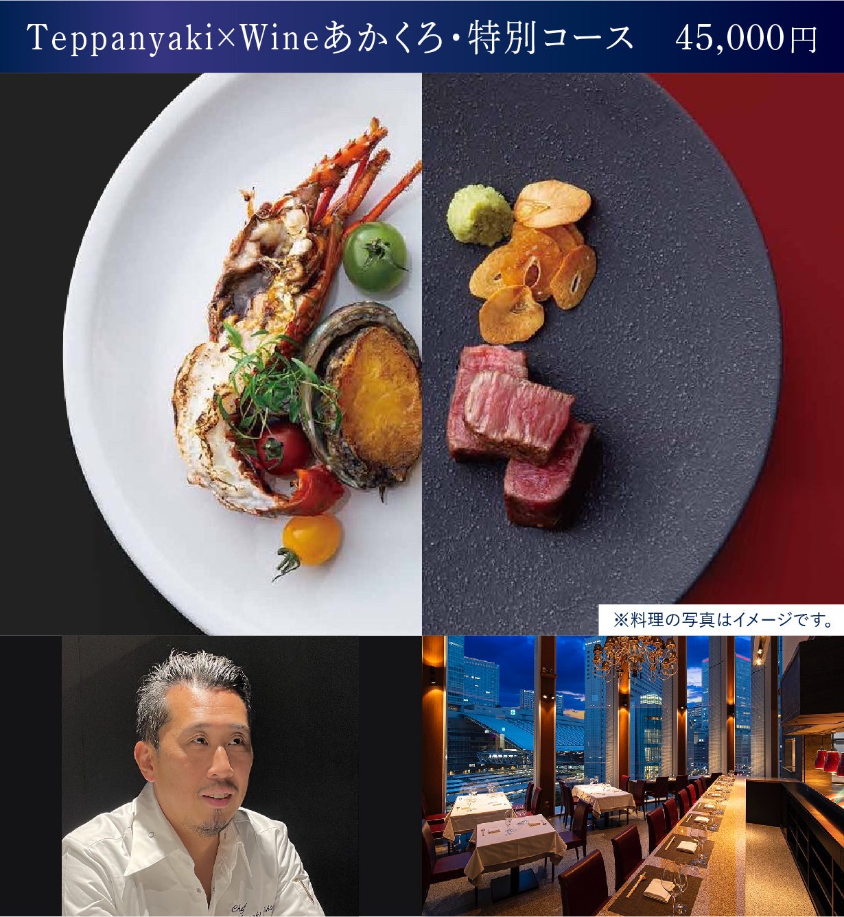 ■Teppanyaki×Wineあかくろ/非日常を演出する鉄板焼きの枠を超えた人気店。厳選した山海の幸を仕入れ、最先端かつ多彩な調理で極上の肉の味わいを提案。世界各国のワインが揃っています。大阪府大阪市北区梅田2丁目2-22 ハービスPLAZA ENT