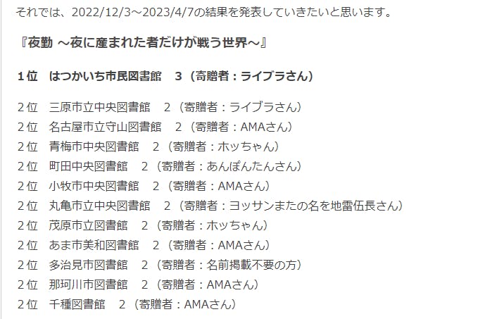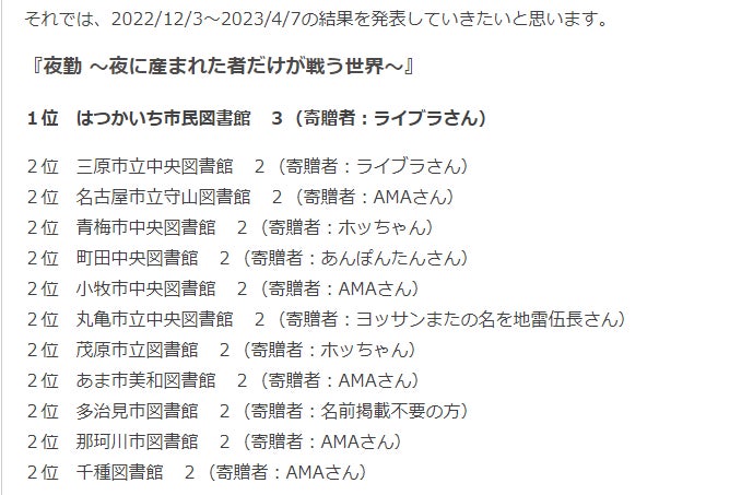 2023/04/14 16:21友浦乙歌です。いつも応援本当にありがとうございます。今年も四分の一が過ぎ去り、早くも4月となりました。今回はほぼ寄贈のみのクラウドファンディングということもあり、一旦ここで、四半年分の貸出数をまとめてみたいと思います。とはいえ、『夜勤 ~夜に産まれた者だけが戦う世界~』の発売が12月だったのと、前回の調査が2022年12月2日に行われているので、それ以降の12月分からのまとめになります。(なので四か月分)また、友浦が「カーリル」という全国の貸出中の図書館を一望できるアプリで目視で確認できた分だけになりますので、正確には不明です;前回の調査を確認したい方は、こちらに載せています。https://tmur.fanbox.cc/posts/4864116※FANBOX記事となり、こちらは月額550円かかりますご了承ください。※この月額の支援分も創作活動の非常に強い支えとなっています。それでは、2022/12/3~2023/4/7の結果を発表していきたいと思います。『夜勤 ~夜に産まれた者だけが戦う世界~』1位 はつかいち市民図書館 3(寄贈者:ライブラさん)2位 三原市立中央図書館 2(寄贈者:ライブラさん)2位 名古屋市立守山図書館 2(寄贈者:AMAさん)2位 青梅市中央図書館 2(寄贈者:ホッちゃん)2位 町田中央図書館 2(寄贈者:あんぽんたんさん)2位 小牧市中央図書館 2(寄贈者:AMAさん)2位 丸亀市立中央図書館 2(寄贈者:ヨッサンまたの名を地雷伍長さん)2位 茂原市立図書館 2(寄贈者:ホッちゃん)2位 あま市美和図書館 2(寄贈者:AMAさん)2位 多治見市図書館 2(寄贈者:名前掲載不要の方)2位 那珂川市図書館 2(寄贈者:AMAさん)2位 千種図書館 2(寄贈者:AMAさん)3位 旭川市図書館 1(寄贈者:ライブラさん)3位 東海市立中央図書館 1(寄贈者:AMAさん)3位 名古屋市瑞穂文化小劇場 1(寄贈者:松永拓海さん)3位 名古屋市立瑞穂図書館 1(寄贈者:AMAさん)3位 相模原市立図書館 1(寄贈者:あんぽんたんさん)3位 宮崎市立図書館 1(寄贈者:AMAさん)3位 浦安市立中央図書館 1(寄贈者:あんぽんたんさん)3位 姫路市立図書館 1(寄贈者:ライブラさん)3位 豊川市中央図書館 1(寄贈者:友浦王国)3位 都城市立図書館 1(寄贈者:ライブラさん)3位 伊勢崎市図書館 1(寄贈者:友浦王国)3位 新潟市立中央図書館 1(寄贈者:友浦王国)3位 北区立中央図書館 1(寄贈者:K@謎真面目さん)3位 春日井市図書館 1(寄贈者:AMAさん)3位 大口町立図書館 1(寄贈者:るかさん)3位 加須市立加須図書館 1(寄贈者:友浦王国)3位 鈴鹿市立図書館 1(寄贈者:友浦王国)3位 安曇野市中央図書館 1(不明)『雨の庭』1位 岡崎市立中央図書館 3(寄贈者:るかさん)1位 札幌市中央図書館 3(寄贈者:AMAさん) 2位 岩倉市図書館 2(寄贈者:AMAさん)2位 旭川市図書館 2(寄贈者:名前掲載不要の方)2位 東海市立中央図書館 2(寄贈者:AMAさん)2位 三原市立中央図書館 2(寄贈者:寺崎まどかさん)2位 幸田町立図書館 2(寄贈者:るかさん)2位 市立小樽図書館 2(寄贈者:ゆーきさん)3位 名古屋市立守山図書館 1(寄贈者:若葉啓さん)3位 一宮市中央図書館 1(寄贈者:名前掲載不要の方)3位 名古屋市立中川図書館 1(寄贈者:若葉啓さん)3位 青梅市中央図書館 1(寄贈者:ホッちゃん)3位 おおぶ文化交流の杜図書館 1(寄贈者:AMAさん)3位 愛西市中央図書館 1(寄贈者:るかさん)3位 小松島市立図書館 1(寄贈者:ライブラさん)3位 足利市立図書館 1(寄贈者:ライブラさん)3位 会津若松市立会津図書館 1(寄贈者:あんぽんたんさん)3位 瀬戸市立図書館 1(寄贈者:なりちゃん)3位 川越市立中央図書館 1(寄贈者:ホッちゃん)3位 尾鷲市立図書館 1(寄贈者:るかさん)3位 姶良市立中央図書館 1(寄贈者:友浦王国)3位 守口市立図書館 1(寄贈者:なりちゃん)3位 長崎市立図書館 1(寄贈者:AMAさん)3位 大和高田市立図書館 1(寄贈者:なりちゃん)3位 千歳市立図書館 1(寄贈者:友浦王国)3位 海津図書館 1(寄贈者:名前掲載不要の方)3位 大垣市立図書館 1(寄贈者:AMAさん)3位 山形県立図書館 1(寄贈者:友浦王国)3位 松原市民図書館 読書の森 1(寄贈者:なりちゃん)3位 久留米市立中央図書館 1(寄贈者:若葉啓さん)3位 北見市立中央図書館 1(寄贈者:友浦王国)『四次元の箱庭』1位 名古屋市立守山図書館 2(寄贈者:友浦王国) 2位 岩倉市図書館 1(寄贈者:なりちゃん)2位 一宮市中央図書館 1(寄贈者:名前掲載不要の方)2位 長浜市立長浜図書館 1(寄贈者:若葉啓さん)2位 高浜市立図書館 1(寄贈者:若葉啓さん)2位 豊明市立図書館 1(寄贈者:ライブラさん)こんなにたくさんの人が読んでくれたのだと思うと、感無量です。本当に感謝の思いでいっぱいです。図書館に来る人は、発売されたばかりの新刊とか関係なく、大きなポスターなんかの宣伝とかも関係なく、ただただ本の山から面白い本を探している人だと思います。そんな方に見つけてもらうために、図書館に置いてもらうことが、それだけが必要なことです。あとは平等に扱われるだけなので……!ご支援のおかげでこんなにたくさん置いてもらえていることに、深く感謝します。また定期的に調査報告をしてまいりたいと思います。これからも寄贈支援をどうぞよろしくお願いいたします。 もっと見る