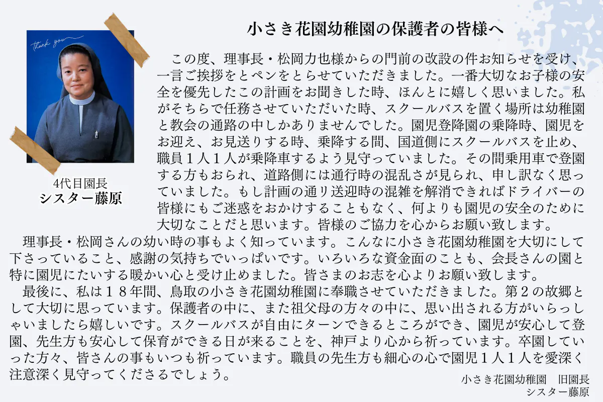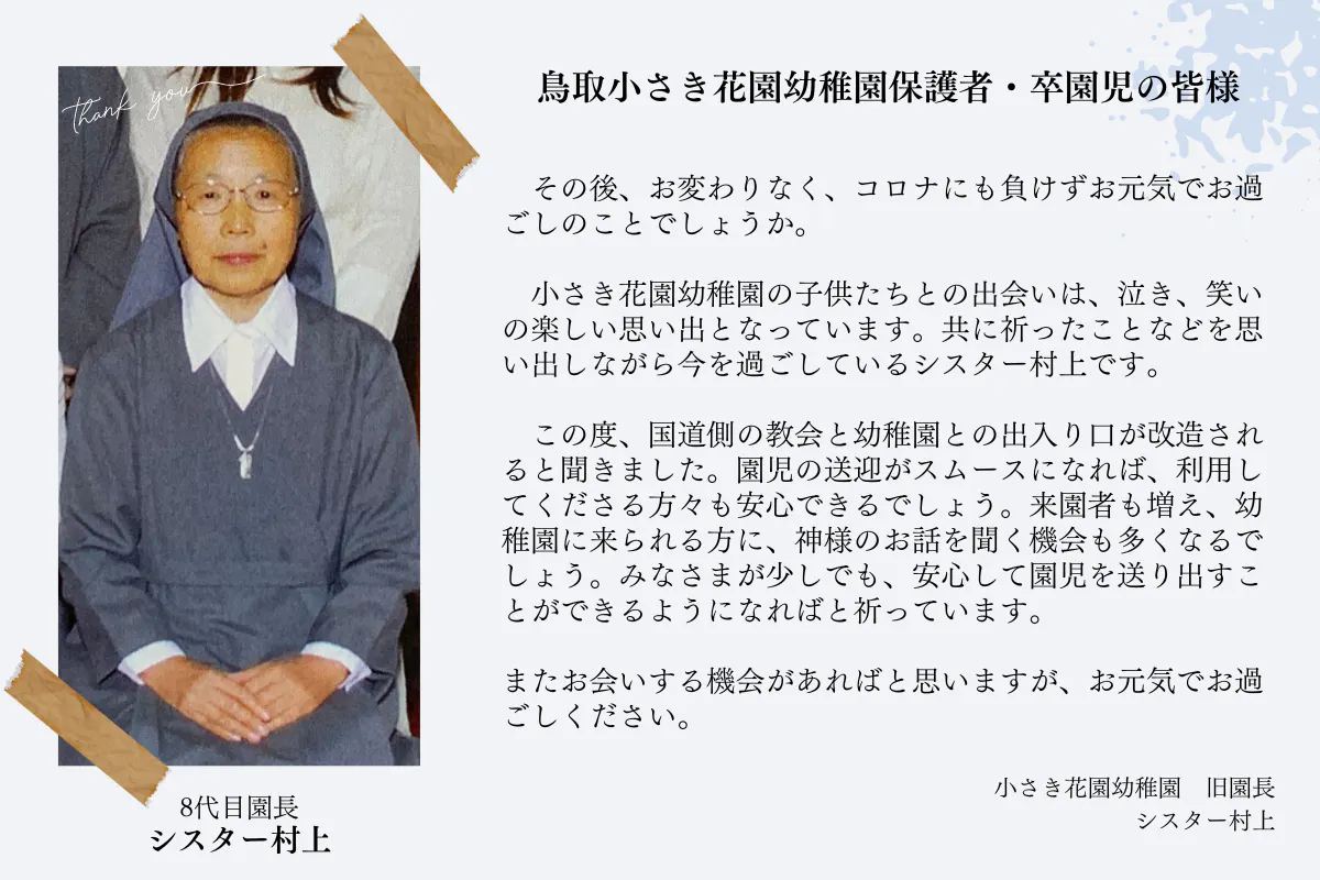 これまでに園長として奉職してくださった歴代のシスターから応援のコメントが届いているので紹介します。