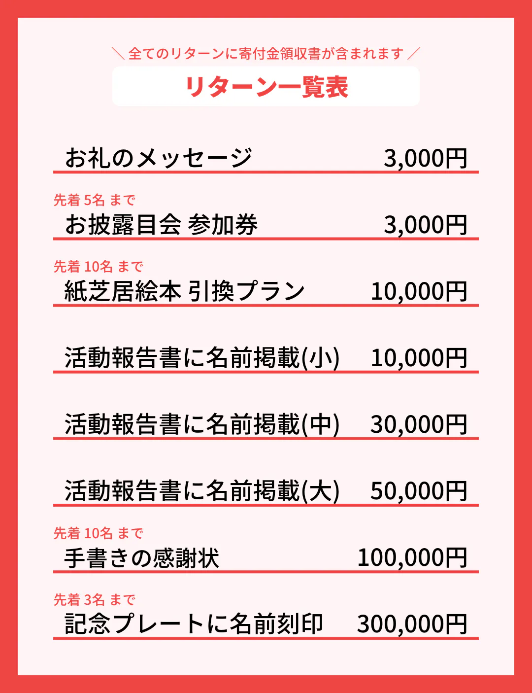 全てのリターンに寄付金領収書が付いており、どのリターンを支援いただいても寄附金控除の対象になります。