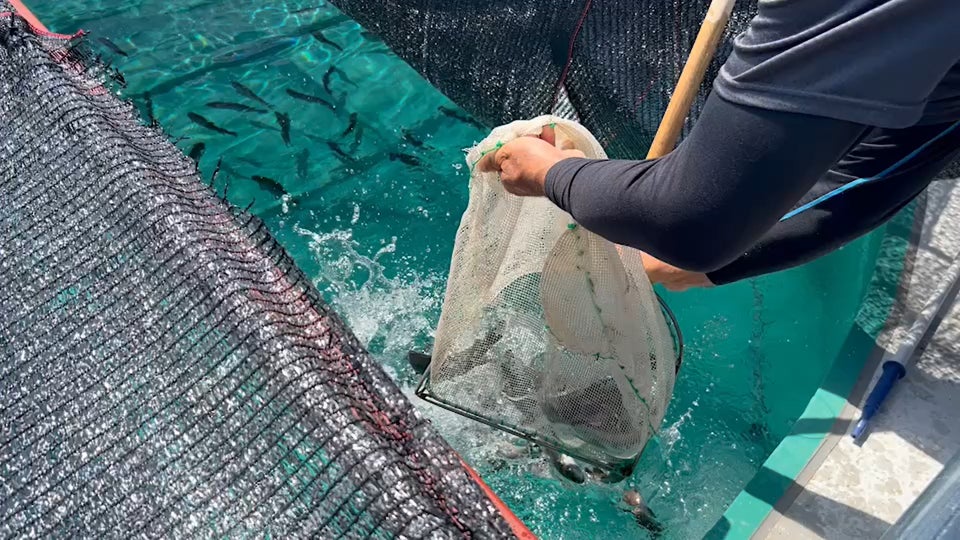 既に年間約500匹程度を出荷できるサイズの陸上養殖生けすを2槽設置しており稚魚を放流し養殖を開始しています。