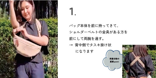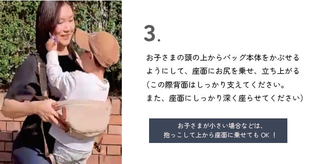 ――「カバンのつけ方を変えるだけで簡単にお子さま を抱っこできるバッグです。