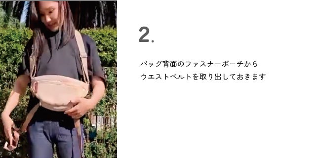 ウエストベルト収納ポケットにはファスナーを採用し、お子さま が大きくなった後はウエストベルトを取り外し、独立したポケットとしてご使用頂けます。