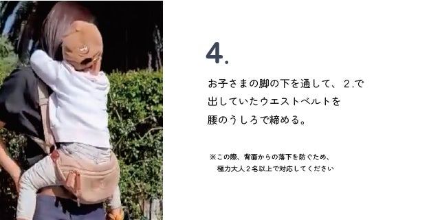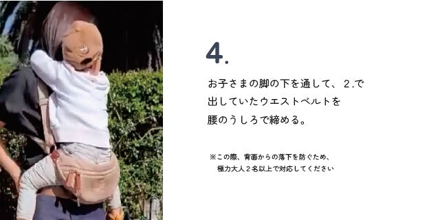 2.ウエストベルト(正面からのずり落ち防止)抱っこ時に、使用者の腰に装着することで、お子さまと使用者さまの間からのズリ落ちを100%防止します。