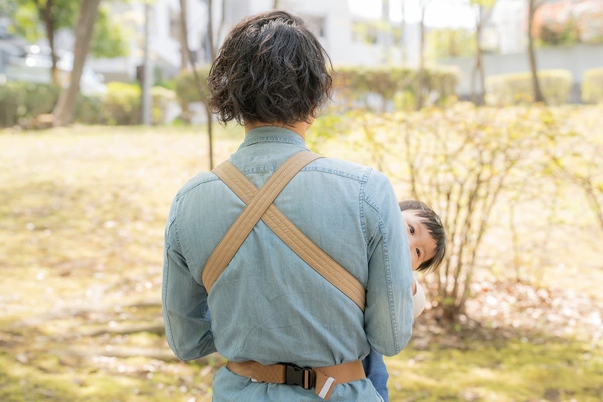 N/ORN Mániは、クロスになったショルダーベルトが肩と背中で子供の体重を支え、ウエストベルトで荷重を分散するので、素手で抱っこするのと比較すると、ものすごく楽になります。