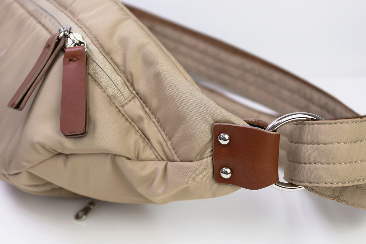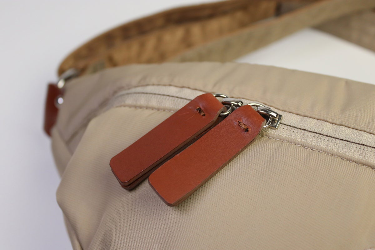 抱っこモード時にスムーズに荷物を出し入れできるようダブルファスナーを採用し、大きく開くようにしました。ファスナーの引き手には握りやすく開閉しやすいフォムルにデザインしたレザーパーツを使用、頻繁に使用する箇所なので丈夫で、且つデザインのポイントとなっています。