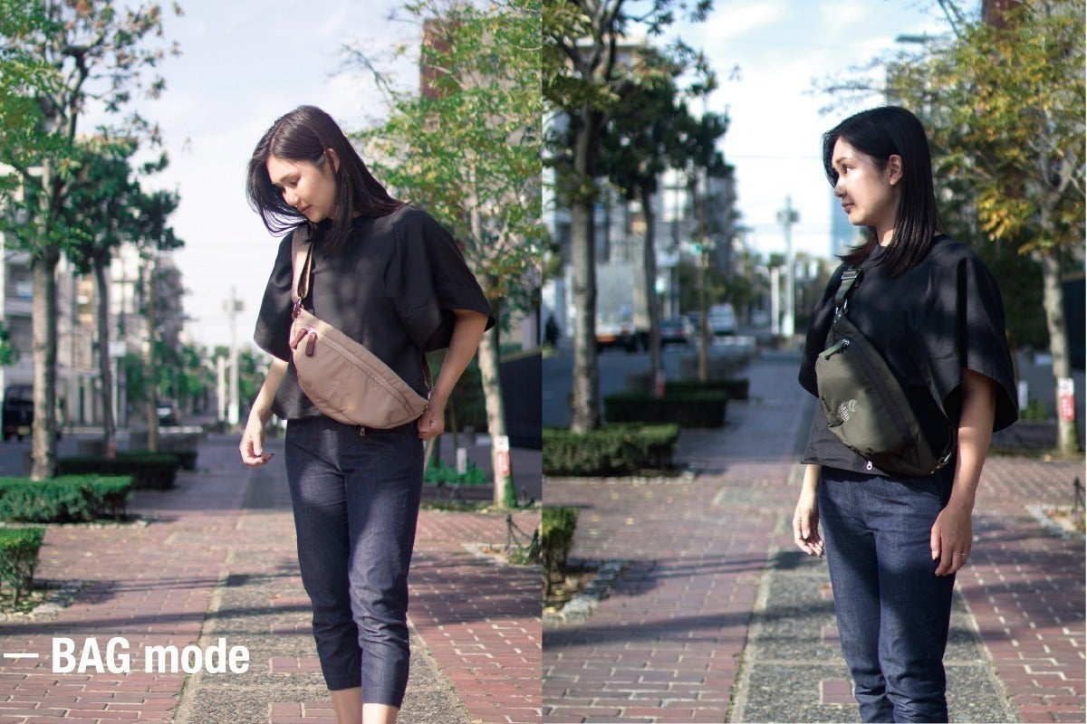 余ったウエストベルトは、クルクルと巻いて付属のゴムで短くまとめることが可能です。 バッグモード時はポケットに収納できます。
