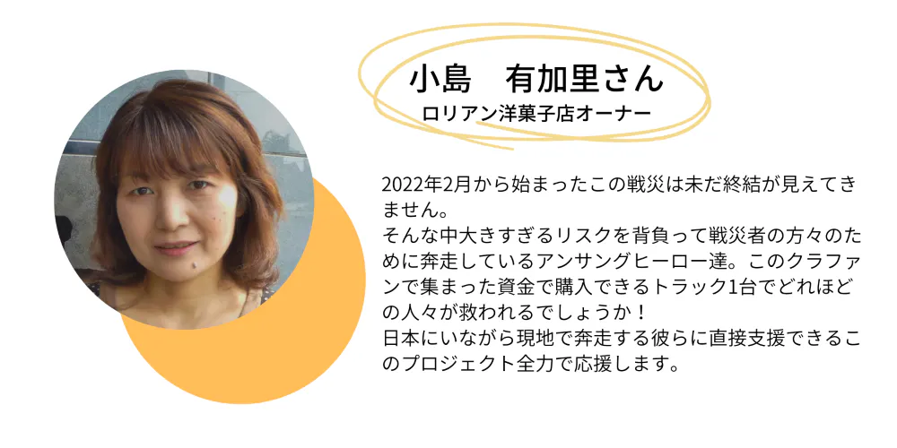 ① ウクライナ国内へ物資を運搬するための車両3台分の購入費用:100万円