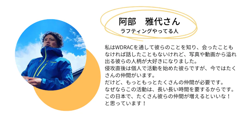 2023/10/05 13:33以前、WDRACの活動にご理解をいただき、ABWに向けた支援活動をいただいた皆様へ私たちが支援するNGO団体『Actions Beyond Words』(以下、ABW)が、ウクライナで行う支援物資運搬の活動をサポートする第2弾のクラウドファンディングを実施します。第2弾のプロジェクトは10月10日(火)の0時より寄付受付を開始する予定です。寄付受付前の段階ですが、内容はご覧いただくことが出来ます。(現在、開始に向け審査中)『ウクライナへ子供たちの学習用PC、ペット用物資、医療用品を届ける活動を支援する』皆様に、今年の5月にご支援いただいたおかげで、ABWは今もなおウクライナで支援活動を続けています。しかしながら、ABWを始めとする小規模民間ボランティアは、戦争が長期化する中で資金難に直面し、活動資金が確保できず撤退を余儀なくされているところもあります。ABWも同様に資金確保にとても苦労しています。このような状況の中、今回はABWがウクライナでの活動を続ける中で得たニーズのうち、この秋から冬に需要があると感じている支援物資運搬のための資金を募るため、本クラウドファンディングを実施することにいたしました。ご寄付はもちろん大歓迎です。それと同様にこのプロジェクトを身近な人に伝えたり、ご自身のSNS等でシェア拡散していただくことが大きな支援に繋がります。ぜひご協力をよろしくお願いします。ひとまず、この秋から冬、ウクライナで避難生活をしながら学ぶ子供たちを、無差別の攻撃で傷ついた人たちを、飼い主が戻る日までペットを守り続ける人たちを支えるため、どうか彼らABWが活動するためご支援ください。どうぞよろしくお願いいたします。 もっと見る