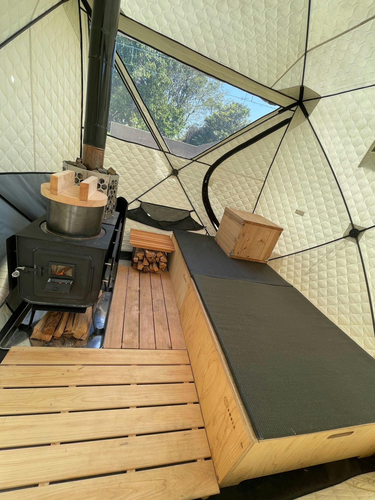 テントサウナ内部は羽釜と畳の和風のセッティング。