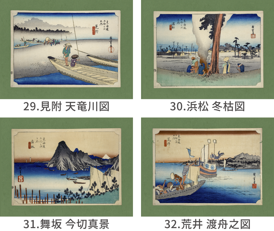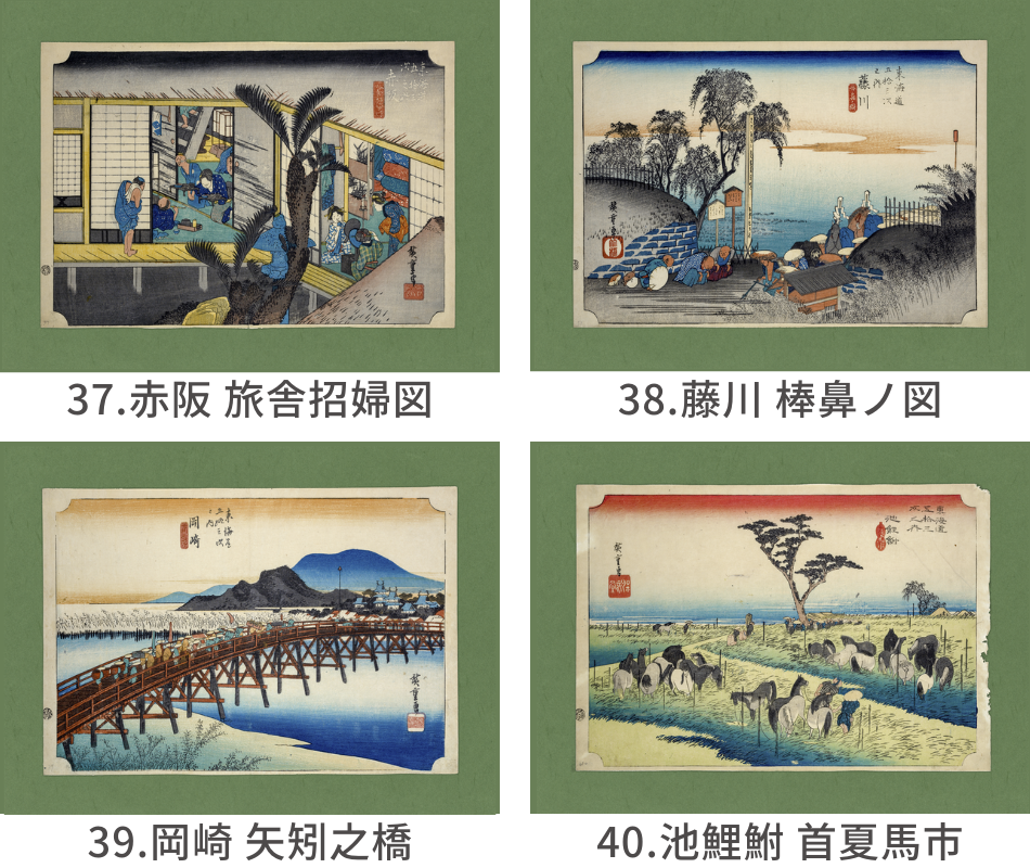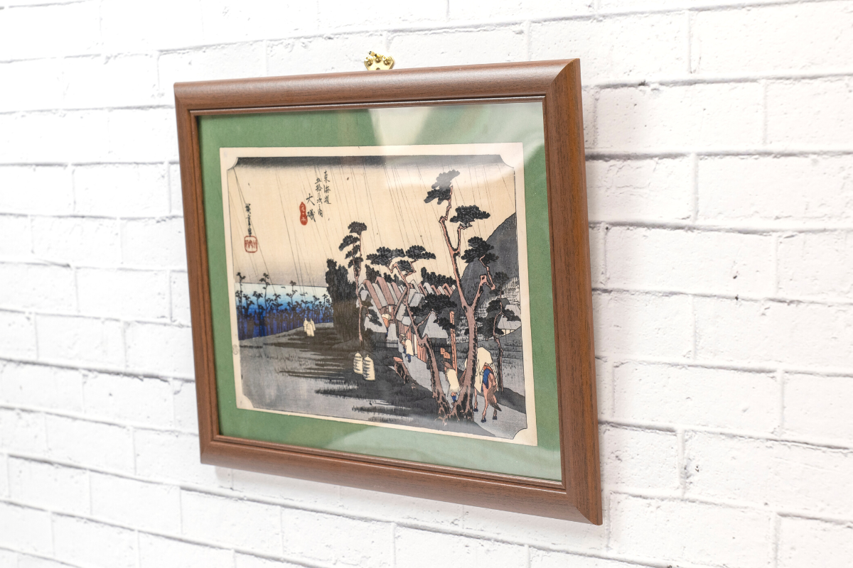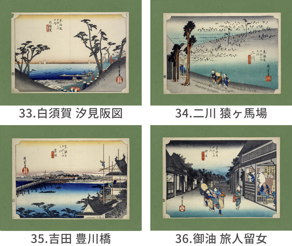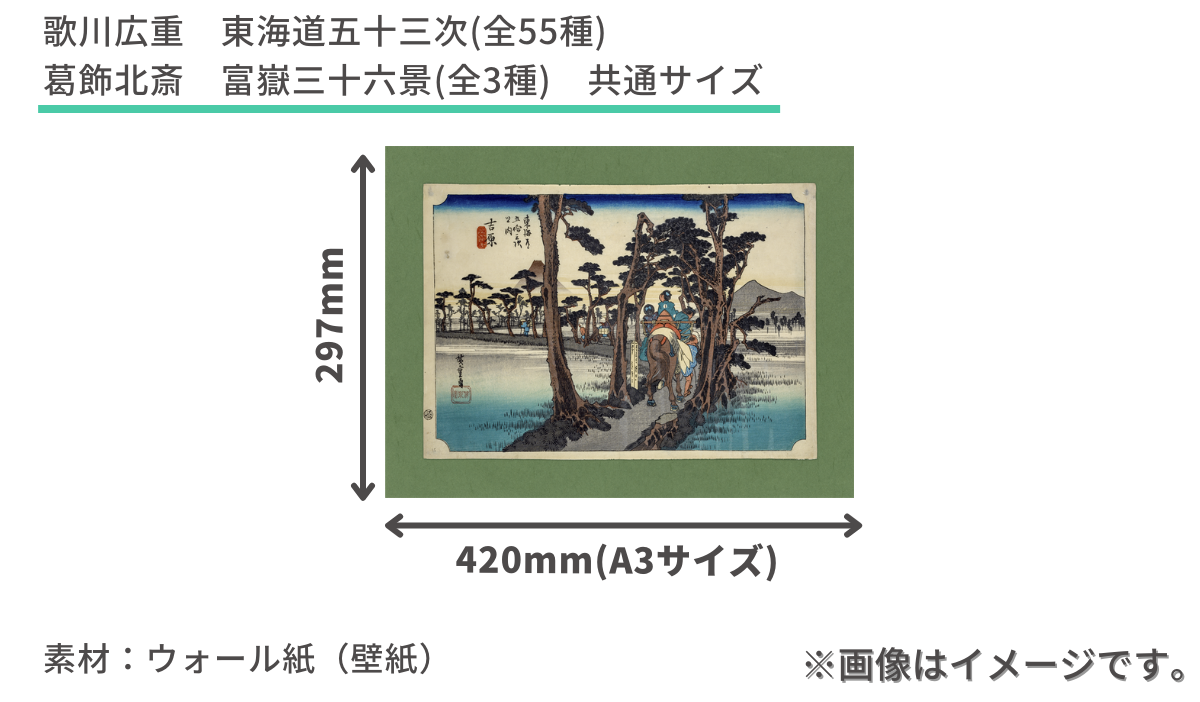 今回ご用意した浮世絵は、江戸時代後期に活躍した画家、歌川広重の東海道五十三次と、葛飾北斎の富嶽三十六景です。さまざまな当時の風景や生活を切り取った絵画を、同時の風合いそのままにお届けします。