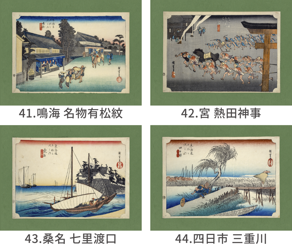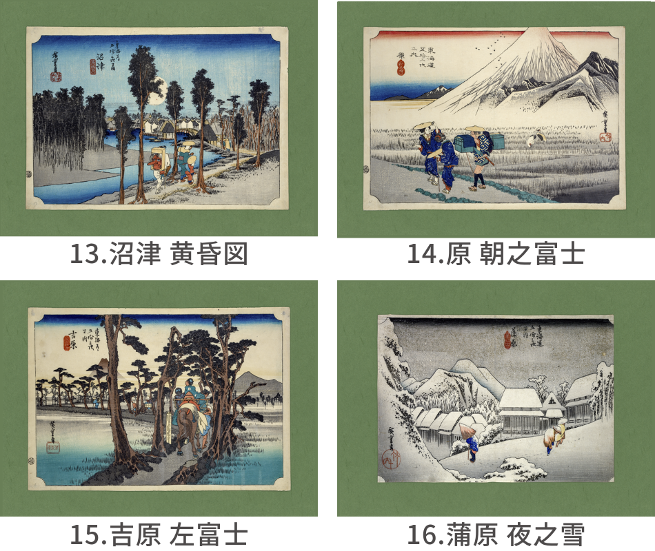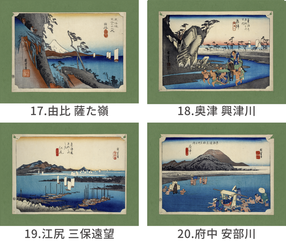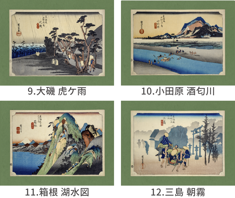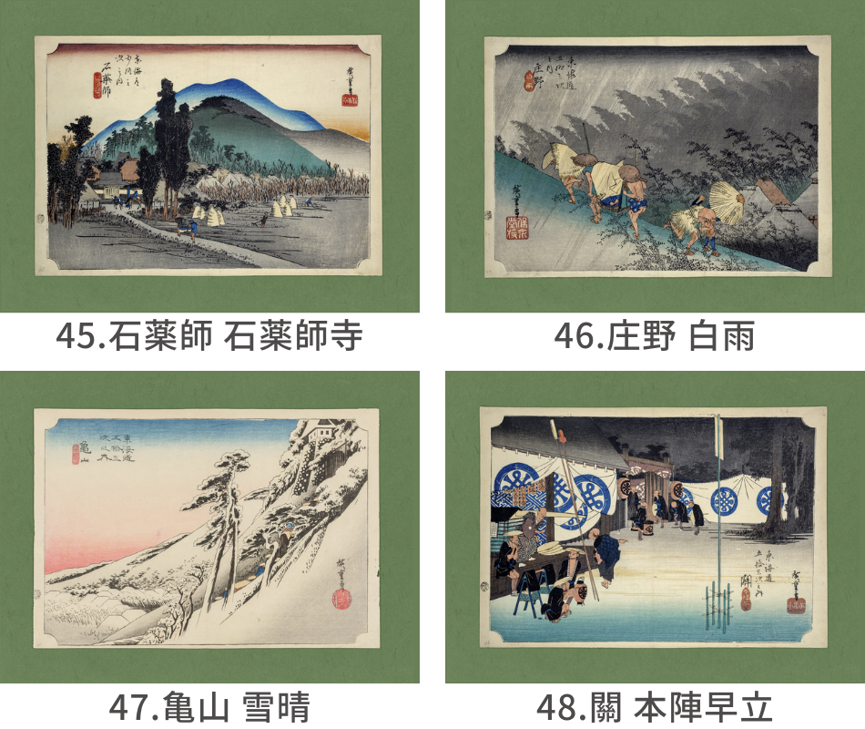 今回ご用意した浮世絵は、江戸時代後期に活躍した画家、歌川広重の東海道五十三次と、葛飾北斎の富嶽三十六景です。さまざまな当時の風景や生活を切り取った絵画を、同時の風合いそのままにお届けします。