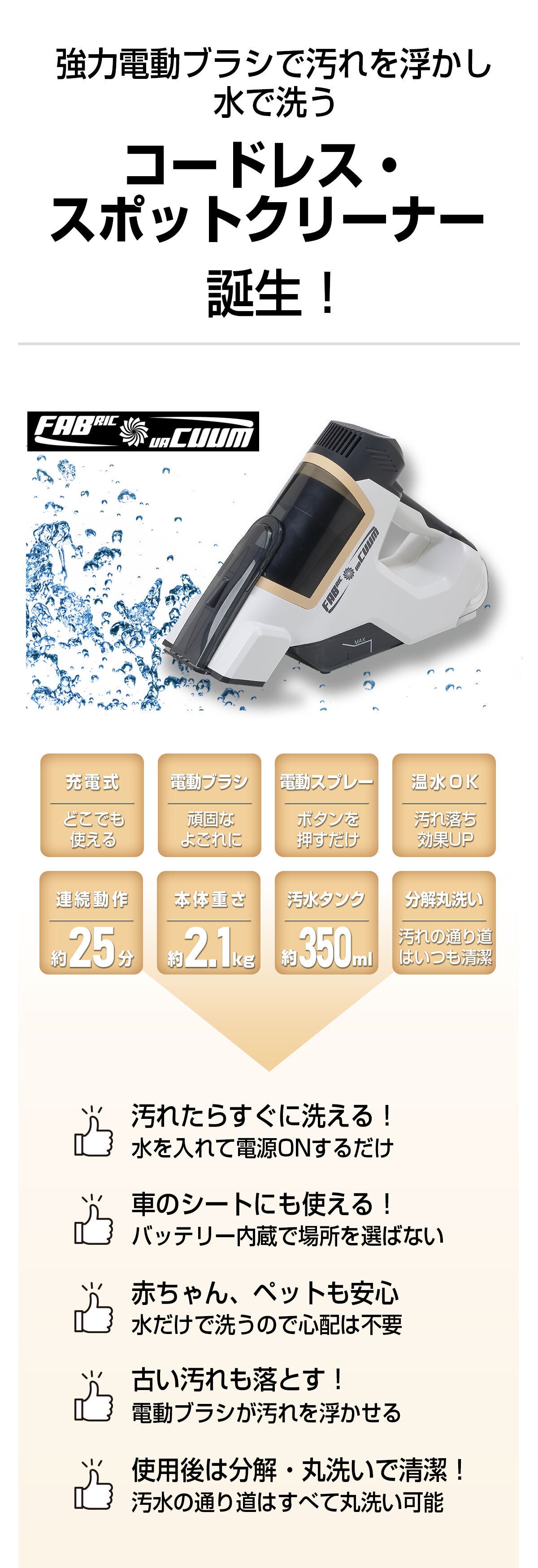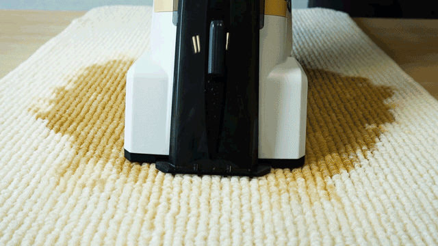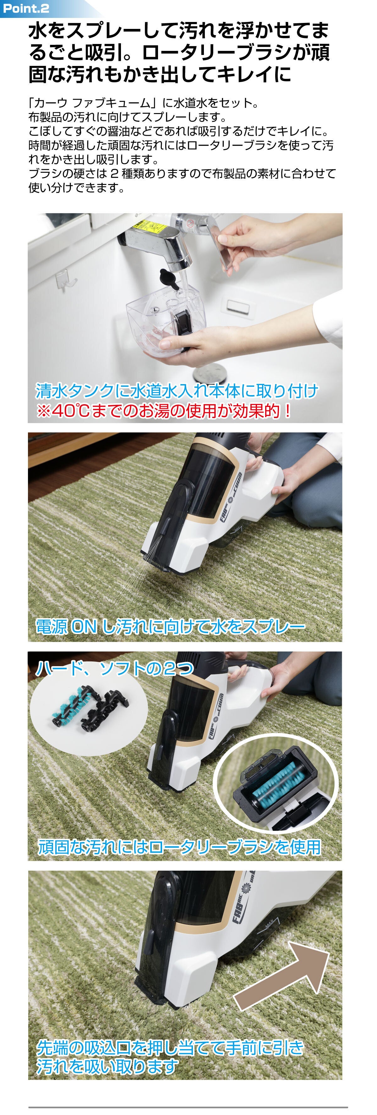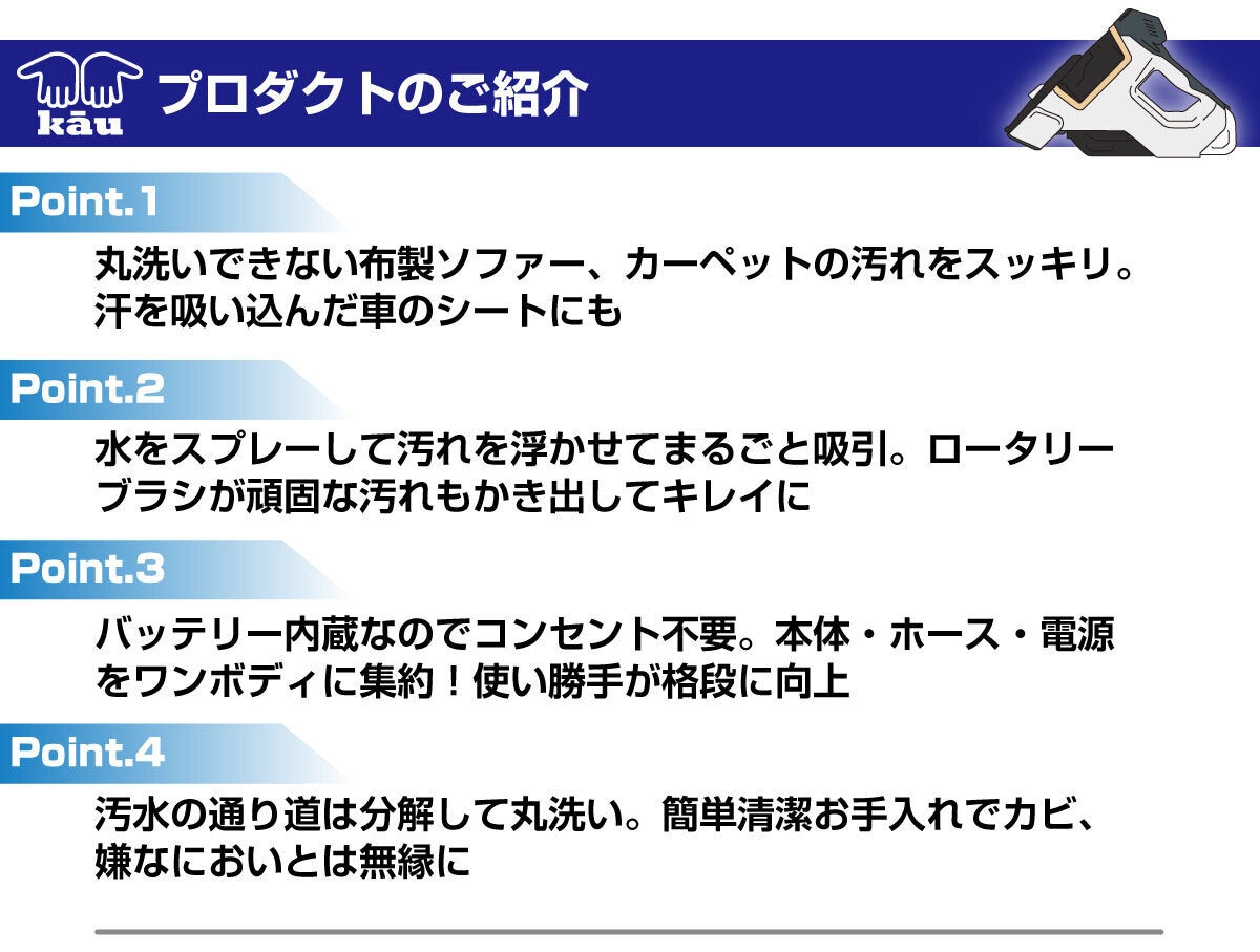 A. 最初に付属ACアダプターを使用して本体を充電してください。清水タンクに水を入れ電源ボタンを押すと動作開始します。スプレーボタンを押し汚れた部分に水をかけてから吸引してください。必要に応じてブラシボタンを押し回転ブラシを併用してください。