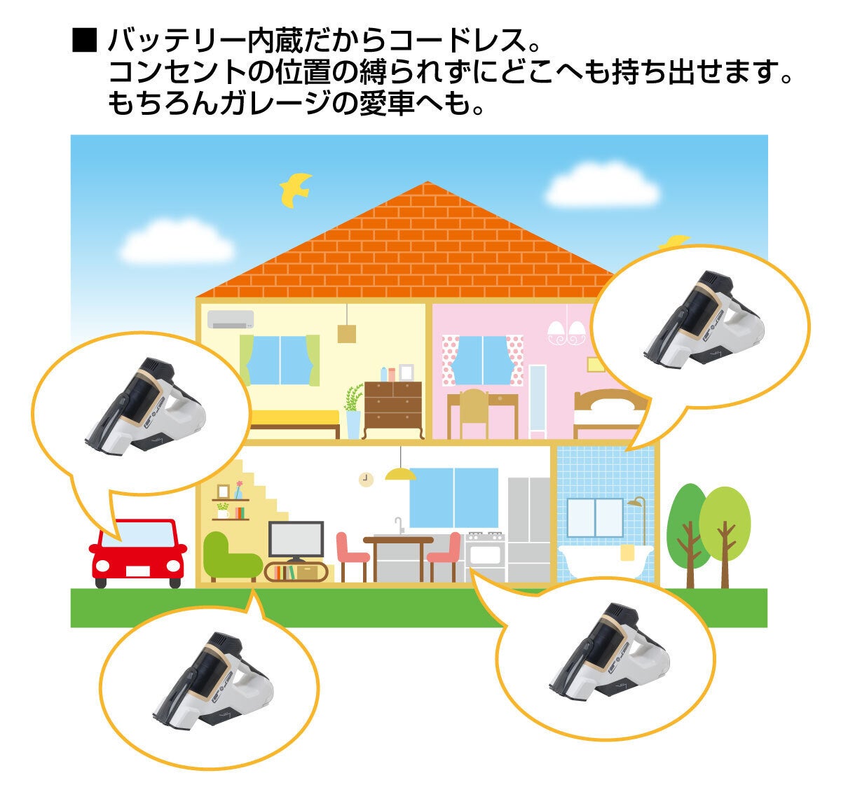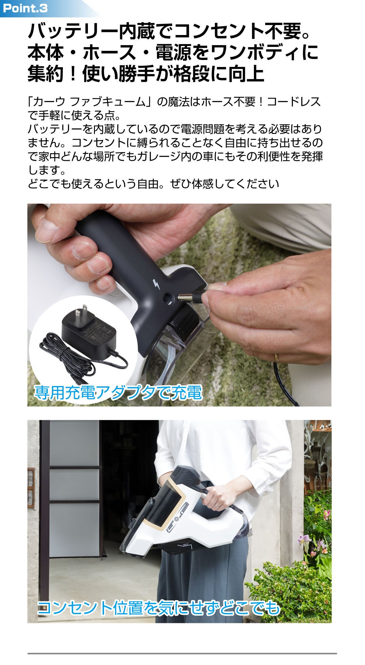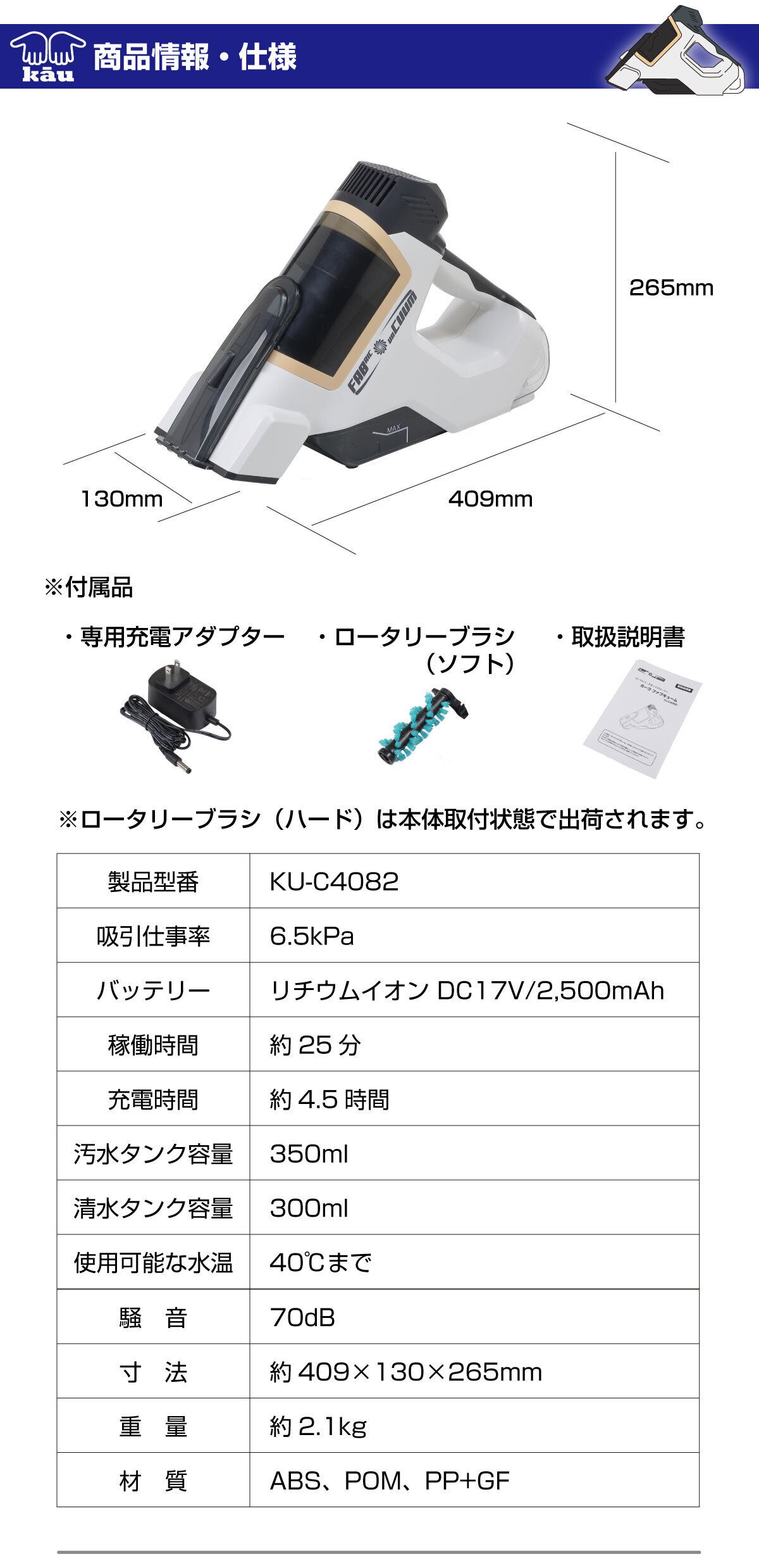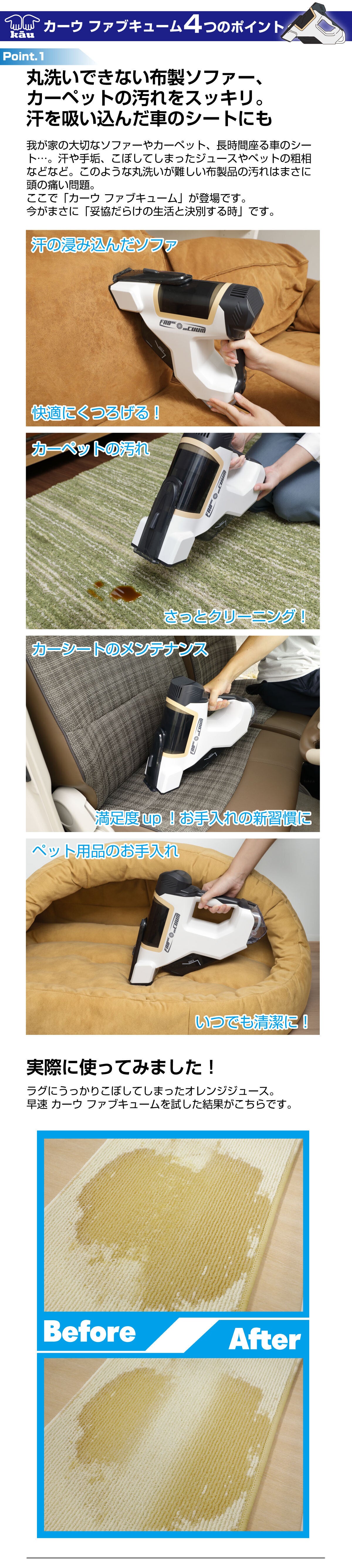 A. 最初に付属ACアダプターを使用して本体を充電してください。清水タンクに水を入れ電源ボタンを押すと動作開始します。スプレーボタンを押し汚れた部分に水をかけてから吸引してください。必要に応じてブラシボタンを押し回転ブラシを併用してください。