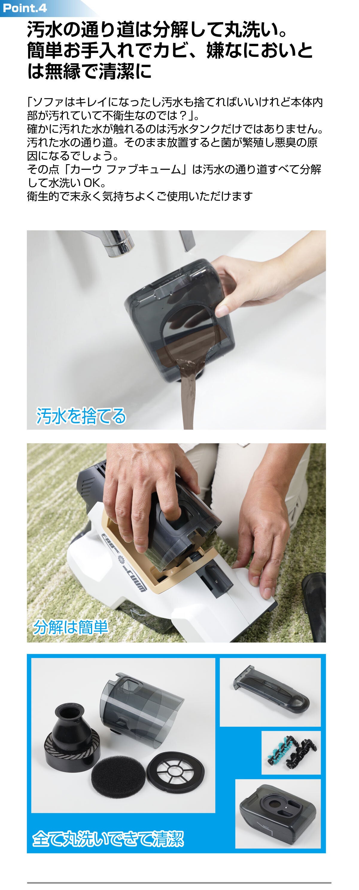 A. 電源をOFFにしマニュアルに従って各部品を取り外してください。汚水が通る部分の部品は全て丸洗い可能です。水気を拭き取り、風通しのよい暗所で乾燥させてください。