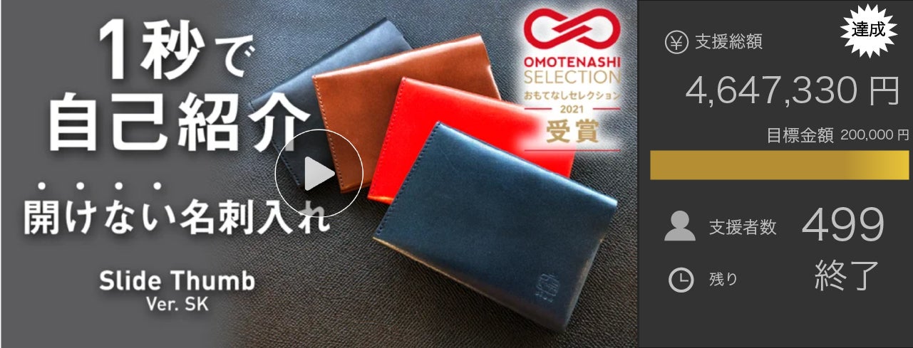 2024/02/01 18:00こんにちは!sion works(シオンワークス)です。開けない名刺入れ「Slide Thumb 50」のプロジェクトが、1月31日(水)に無事に終了しました。12月の開始以来、新色の発売なども並行しながら無事完走出来ました(*^^*)ご支援いただいた皆さま、関係各位には厚く御礼申し上げます。早速、本日から発送準備に入ります。2月中には、お手元に届けられるのではないかと思います。どうぞお楽しみにお待ちください( ・∇・)--------------------------------------【ギフトショー2024に展示】2月6日(水)〜8日(金)に開催されます「東京インターナショナルギフトショー2024春」にhttps://www.giftshow.co.jp/tigs/97tigs/ビックFIREさん(ビックカメラとCAMPFIREの販売支援プログラム)が出展される予定で、そのブース内に採用製品として「Slide Thumb 30」が展示いただけるそうです。来場予定のある方は、ぜひお立ち寄りください(*^^*)--------------------------------------sion works キャンペーン情報などはこちらから もっと見る