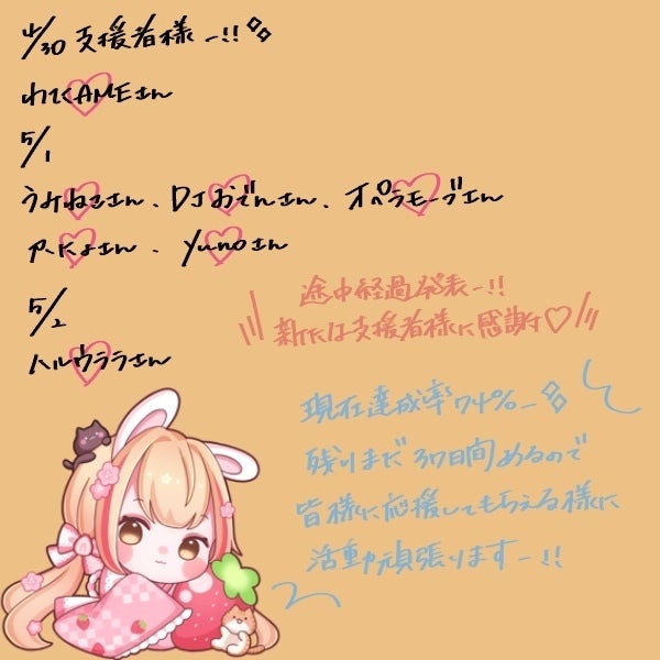 達成率100%だああああー!!!みんなのおかげ…★第2目標【ストレッチゴール】に向けて残りの期間頑張りたいと思います。第2目標は達成率130%(*´꒳`*)8月末に引っ越しするお家の防音環境のために資金を使おうと思っていますっ!!その他ストレッチゴール用のリターン品に使用予定です。残り20日間皆様改めて拡散など是非ご協力お願いいたします(*´꒳`*)※ストレッチゴール用の新プラン現在審査中なので新リターン欲しい方は少し支援待っててねー!!