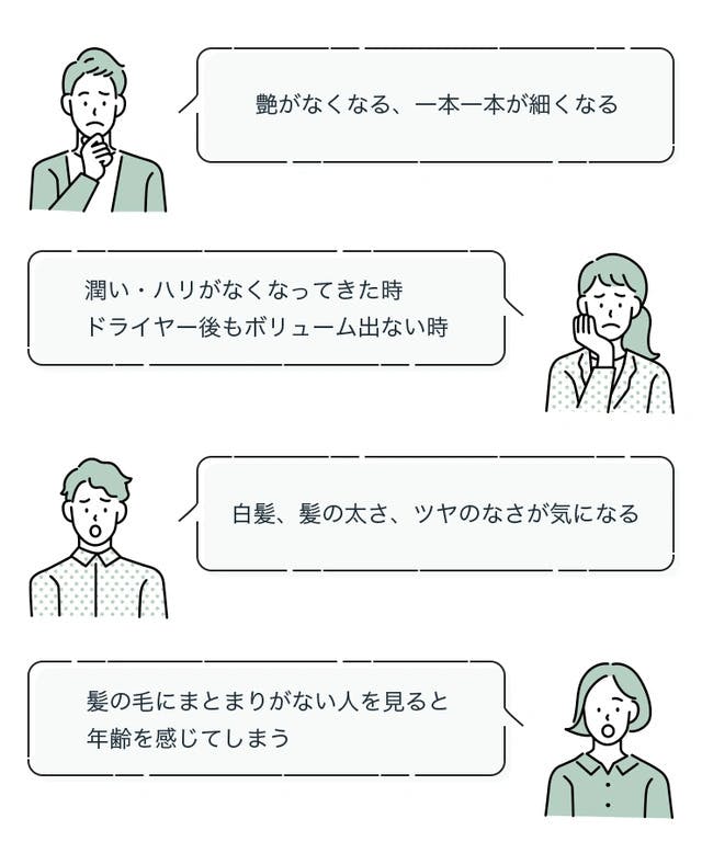 実は髪の毛も、肌と同様に加齢とともに髪質が変化し、ハリ・コシがだんだんと失われていきます。メイクなどでカバーできるお肌とは違い、ごまかしが効きにくいのも悩みのひとつに。