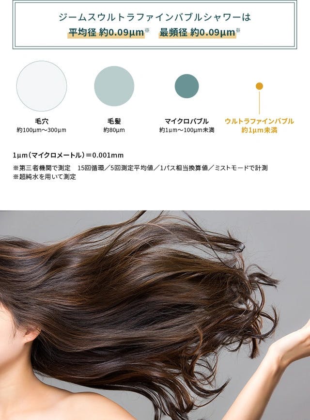 『ジームスウルトラファインバブルシャワー』から発生するウルトラファインバブルは、粒子が極めて小さいため、毛髪の深部まで浸透することが可能。