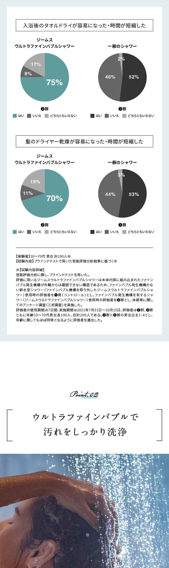 『ジームスウルトラファインバブルシャワー』を実際にお使いいただいた方へアンケートによる調査を行い、一般のシャワーに比べて使用感の良さや髪の毛への効果を感じられた方が70%前後という結果に。