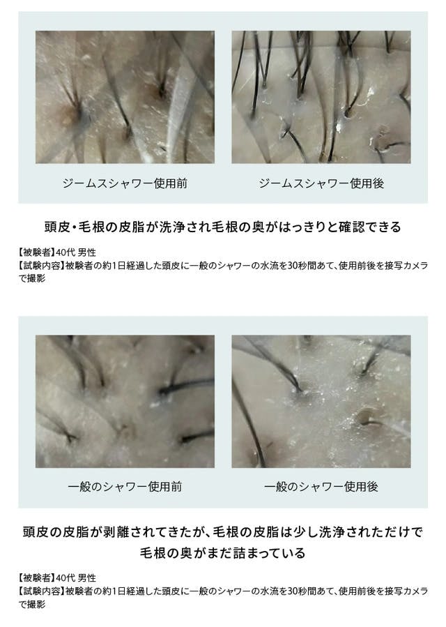 従来のシャワーでは洗いきれなかった頭皮や毛根の汚れ・皮脂も、『ジームスウルトラファインバブルシャワー』を使えば、その超微細な気泡で洗い落とすことが可能です。