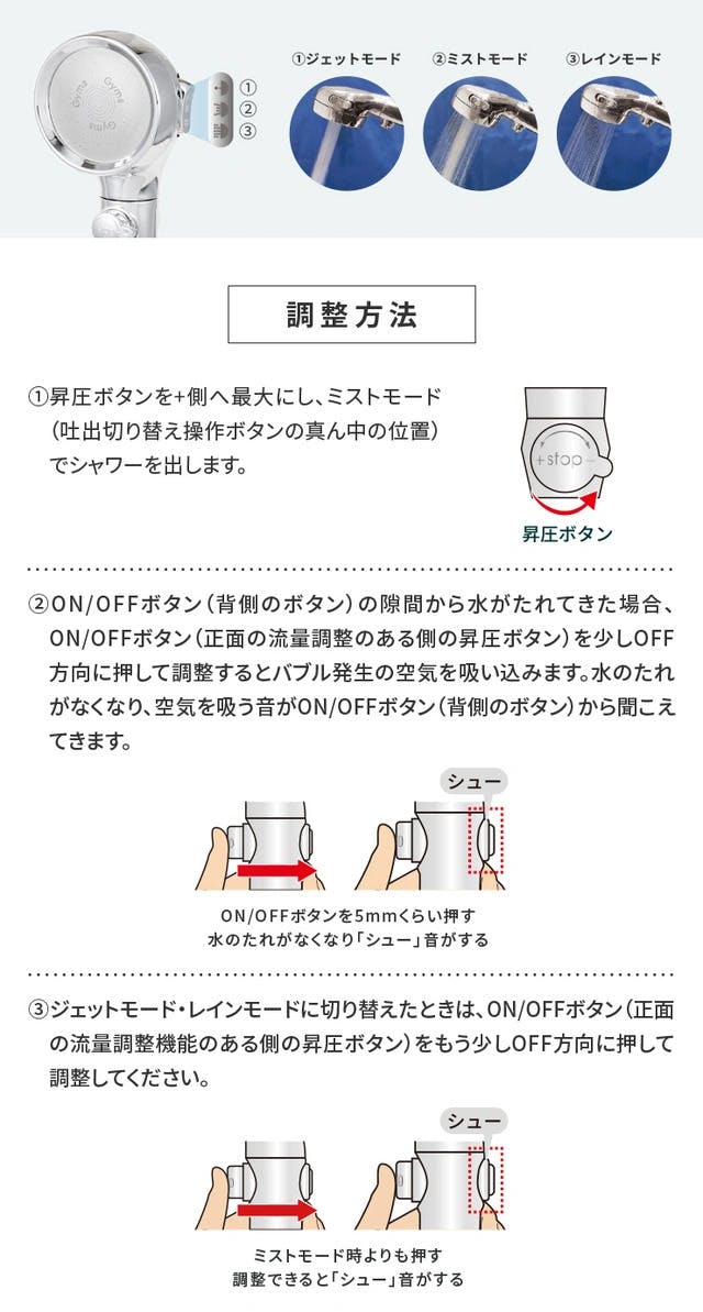 ジームスシャワーは低水圧(0.2Mpa以下)で水の出が極端に少ない使用環境等で、バブル発生の空気を吸い込まない場合は簡単な調整が必要になります。