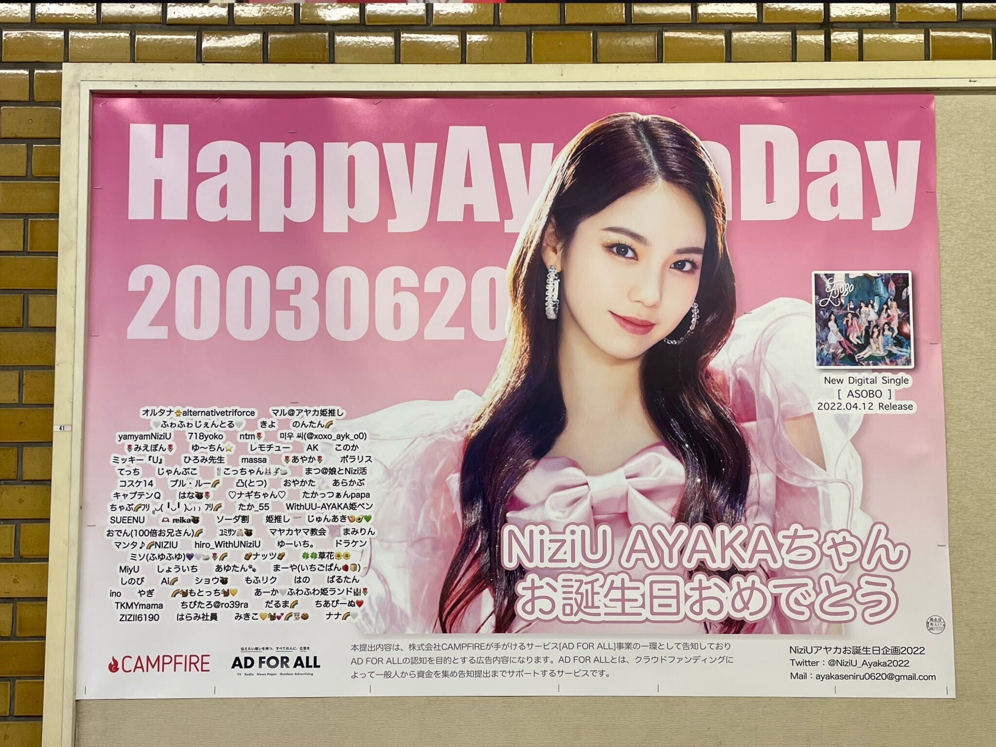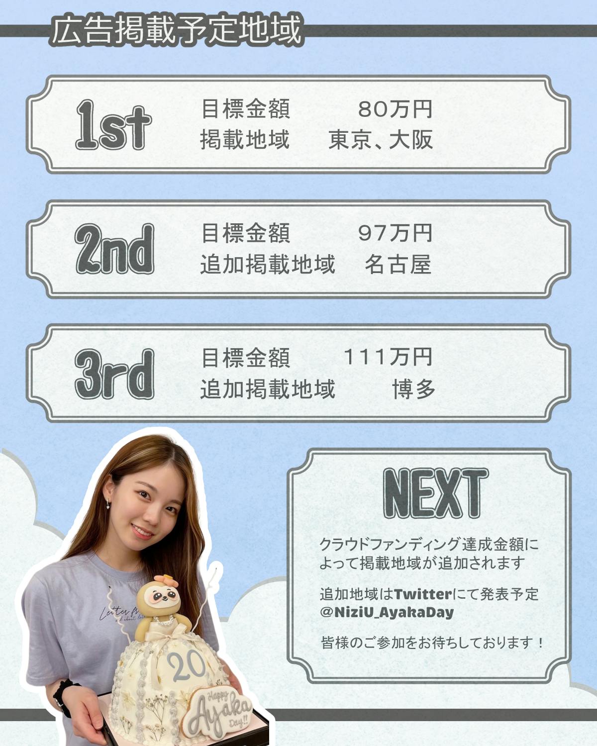 NiziUのメンバーであるアヤカちゃんが6月20日で20歳の誕生日を迎えます。センイル広告で盛大にお祝いするために、プロジェクトを立ち上げました。ぜひ一緒にアヤカちゃんをお祝いしましょう!!