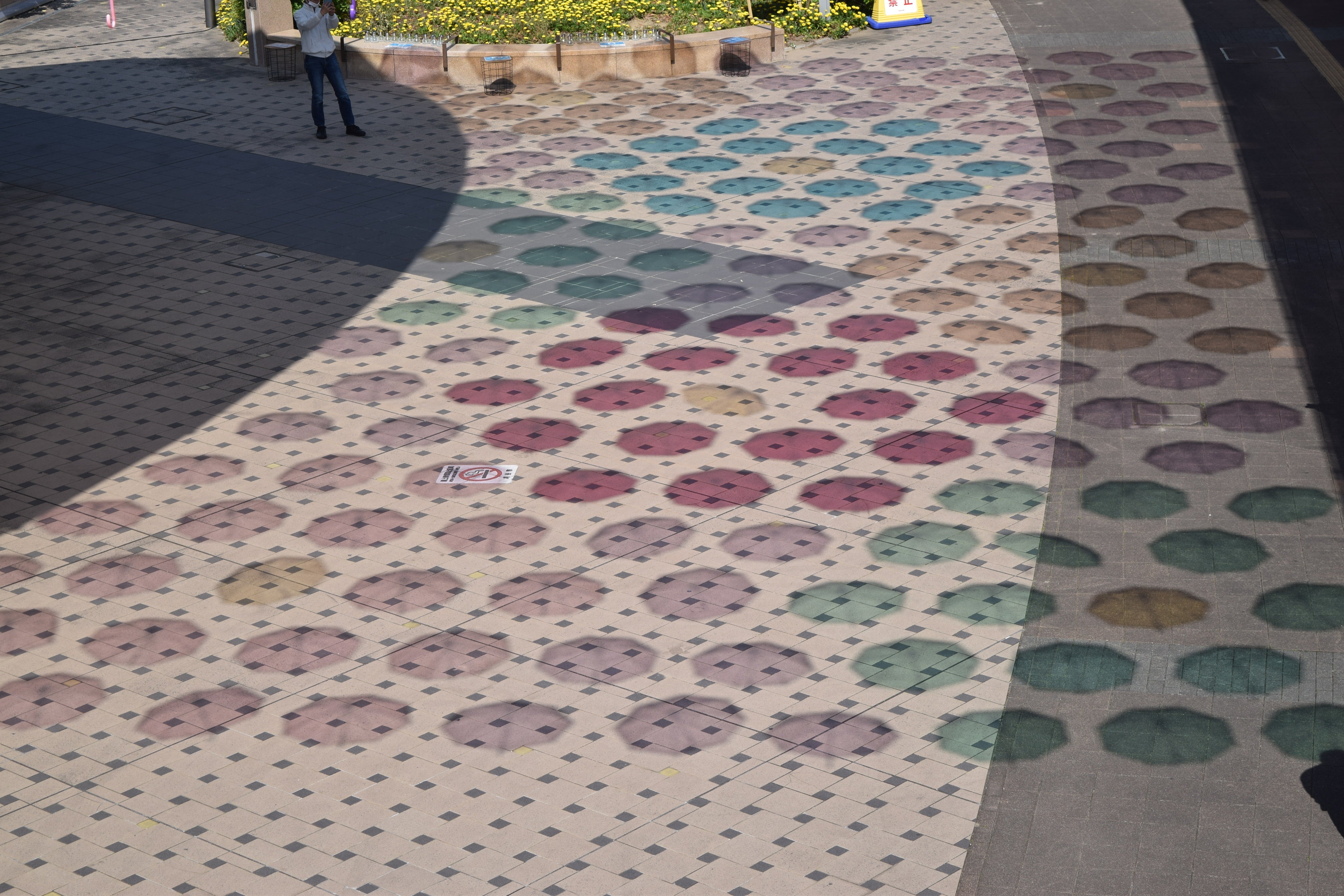 半透明でカラフルな傘を使用し、地面には鮮やかな色が映し出されます。
