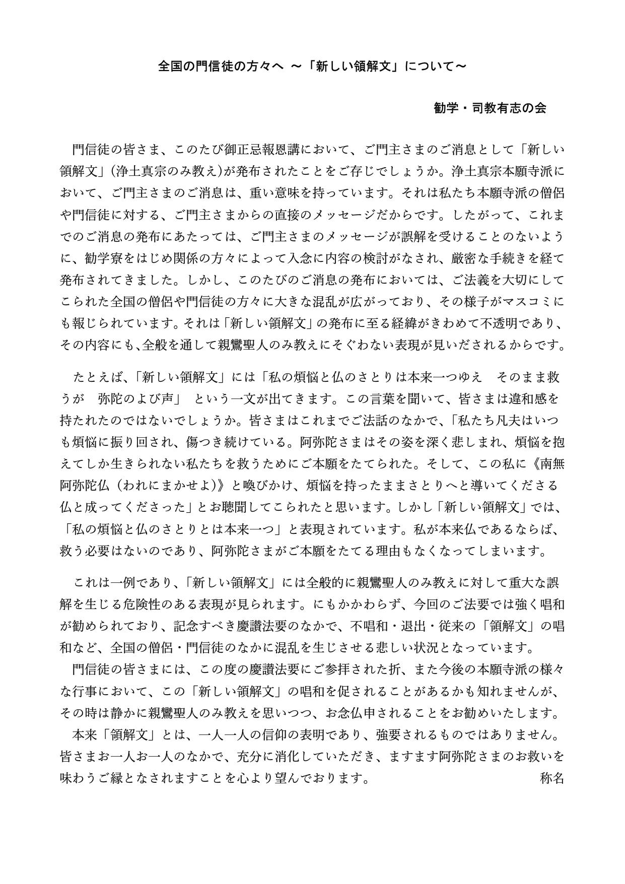 門信徒の皆さま、このたび御正忌報恩講において、ご門主さまのご消息として「新しい領解文」(浄土真宗のみ教え)が発布されたことをご存じでしょうか。浄土真宗本願寺派において、ご門主さまのご消息は、重い意味を持っています。それは私たち本願寺派の僧侶や門信徒に対する、ご門主さまからの直接のメッセージだからです。したがって、これまでのご消息の発布にあたっては、ご門主さまのメッセージが誤解を受けることのないように、勧学寮をはじめ関係の方々によって入念に内容の検討がなされ、厳密な手続きを経て発布されてきました。しかし、このたびのご消息の発布においては、ご法義を大切にしてこられた全国の僧侶や門信徒の方々に大きな混乱が広がっており、その様子がマスコミにも報じられています。それは「新しい領解文」の発布に至る経緯がきわめて不透明であり、その内容にも、全般を通して親鸞聖人のみ教えにそぐわない表現が見いだされるからです。