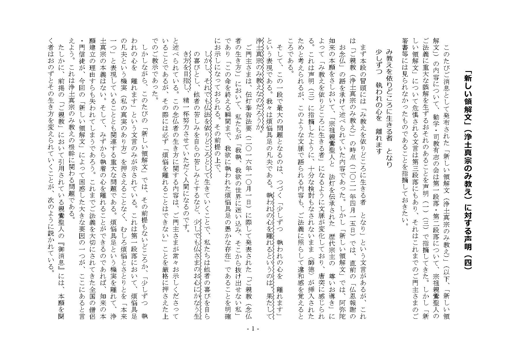 2023年5月5日、浄土真宗本願寺派勧学・司教有志の会から「新しい領解文(浄土真宗のみ教え)」に対する声明の第4弾が発表されました。