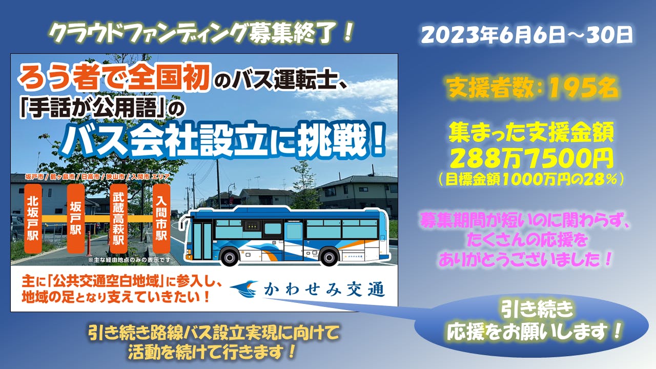 ろう者の松山建也くんの想いが、まさに私たちの夢を現実のことにしようとしています!是非、「かわせみ」のデザインの路線バスが、街を颯爽と走る姿を見ましょう!乗りましょう!みなさまの応援を、どうぞよろしくお願いいたします!