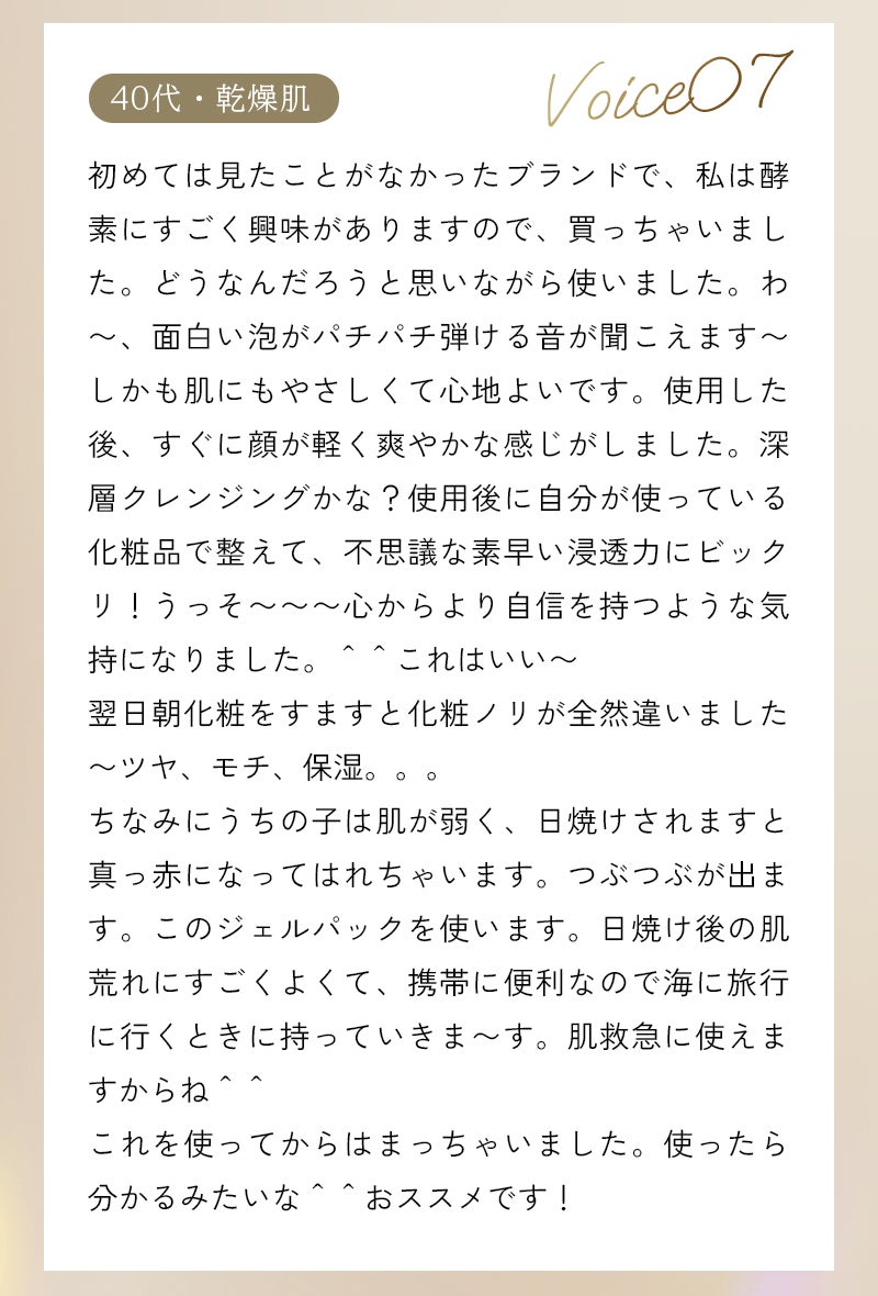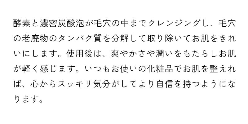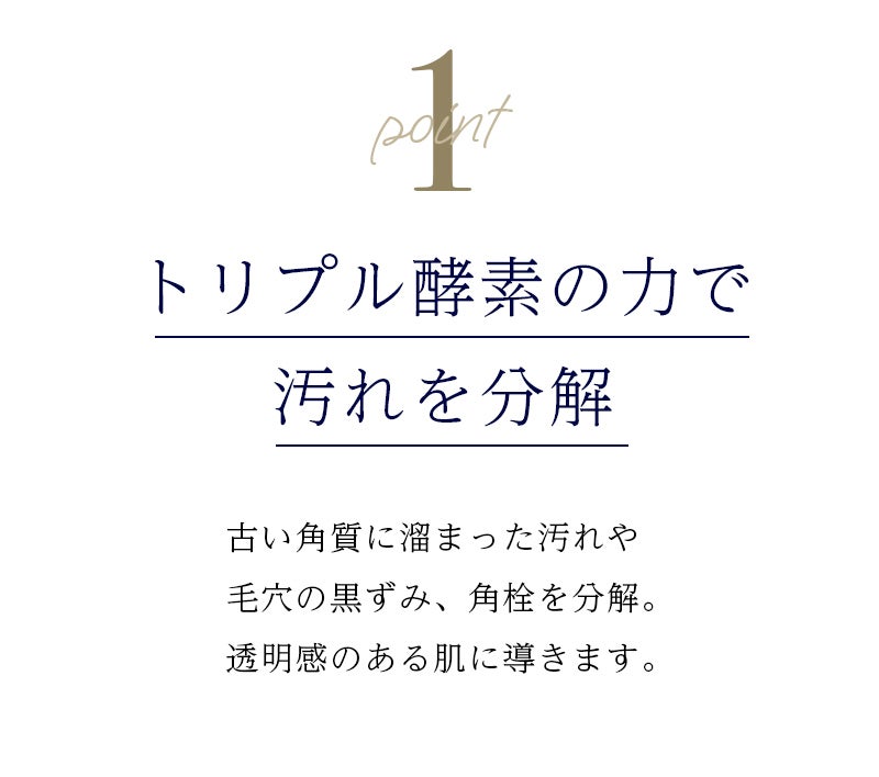 2023/07/26 18:41酵素ってなに?酵素とは、タンパク質で構成されており、体に起こっている化学反応をスムーズにさせる役割があります。酵素の力を利用した洗顔は、皮脂やタンパク質を分解する働きがあるため、普通の洗顔よりもすっきりとした潤いのあるの仕上がりになります。潤いは残したまま、角層や角栓、皮脂のつまりにアプローチ、透明感のあるお肌を目指せます。酵素の働きでお肌が変わる酵素の種類によって働きが異なります。角質によるくすみ(※)やごわつきには、タンパク質分解酵素のパパイン、プロテアーゼ。毛穴に詰まった皮脂(角栓や黒ずんだ脂質)の分解にはリパーゼ。素美肌では、角質から毛穴までアプローチできるよう肌全体のことを考えて配合しています。※くすみ:汚れや古い角質によるまずは2週間毎に1回の使用をお試ししてくださいしっかり汚れを落とすので毎日使うのはおすすめしません。まずは、2週間毎に特別な日のケアとしてご使用してください。きっとお肌のハリやツヤ、潤い感を実感いただけると思います。 もっと見る